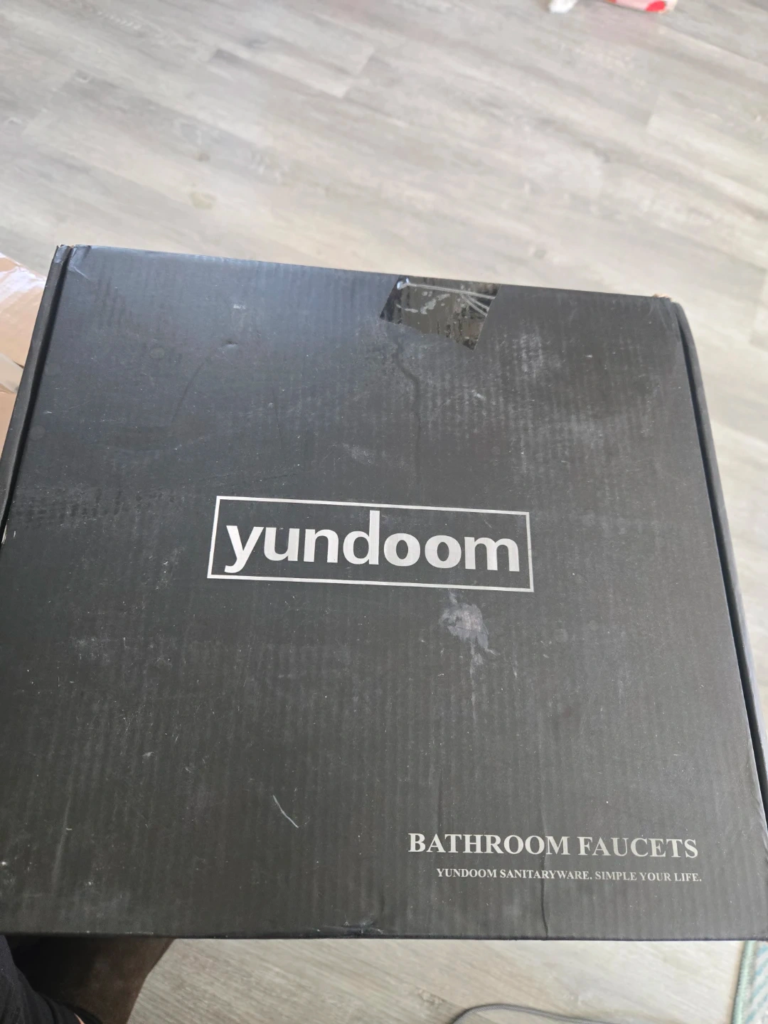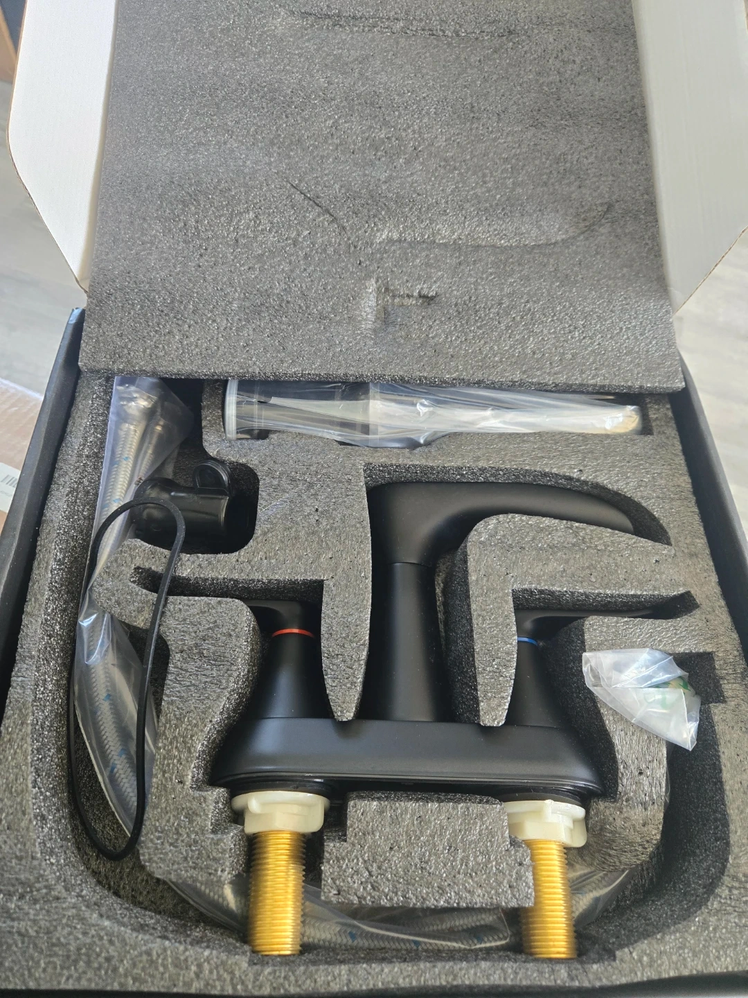 This is a new Yundoome black bathroom faucet. It's a double-handle faucet with a matte black finish. Includes all necessary hoses and mounting hardware. Perfect for a bathroom sink upgrade!