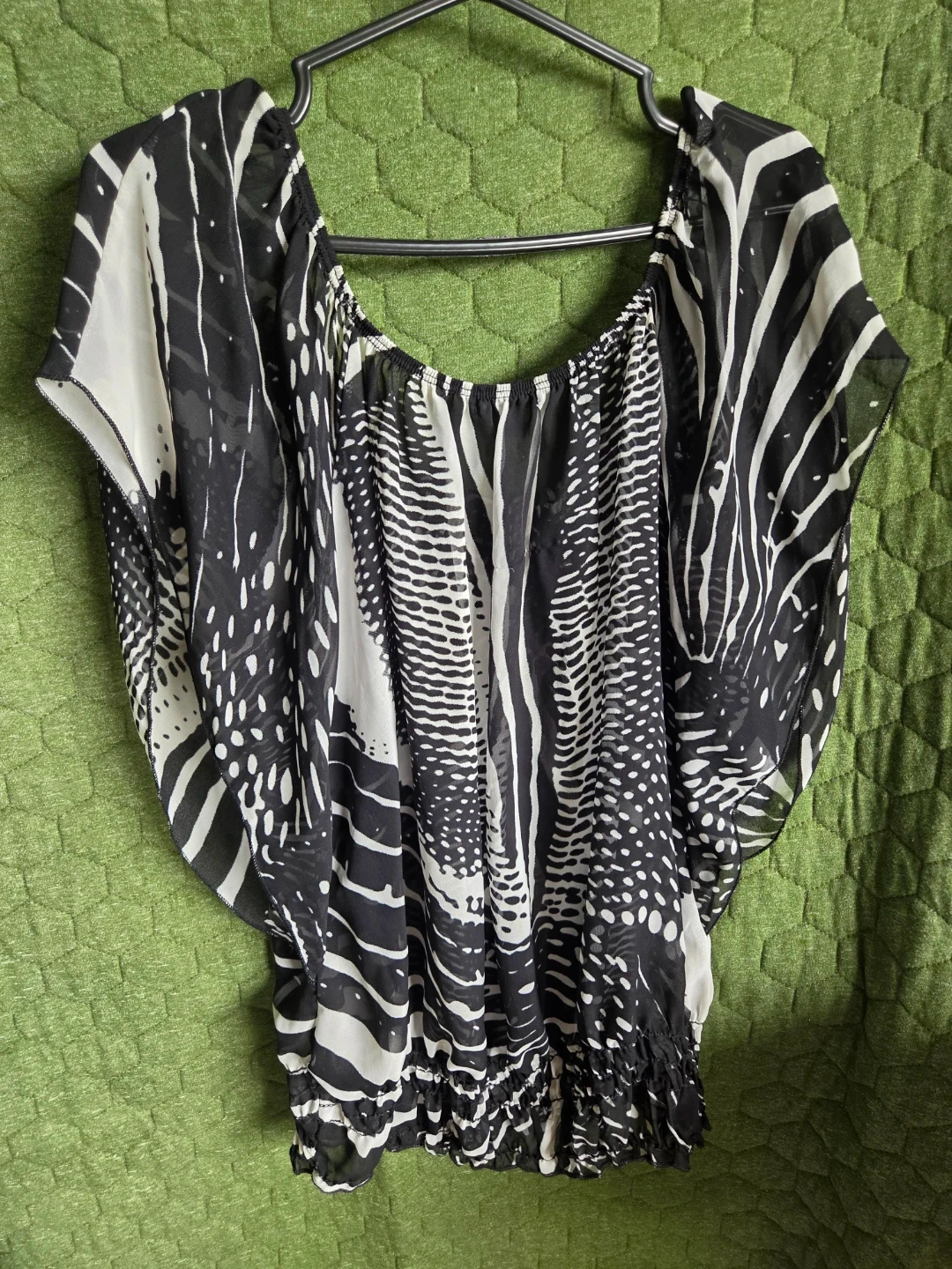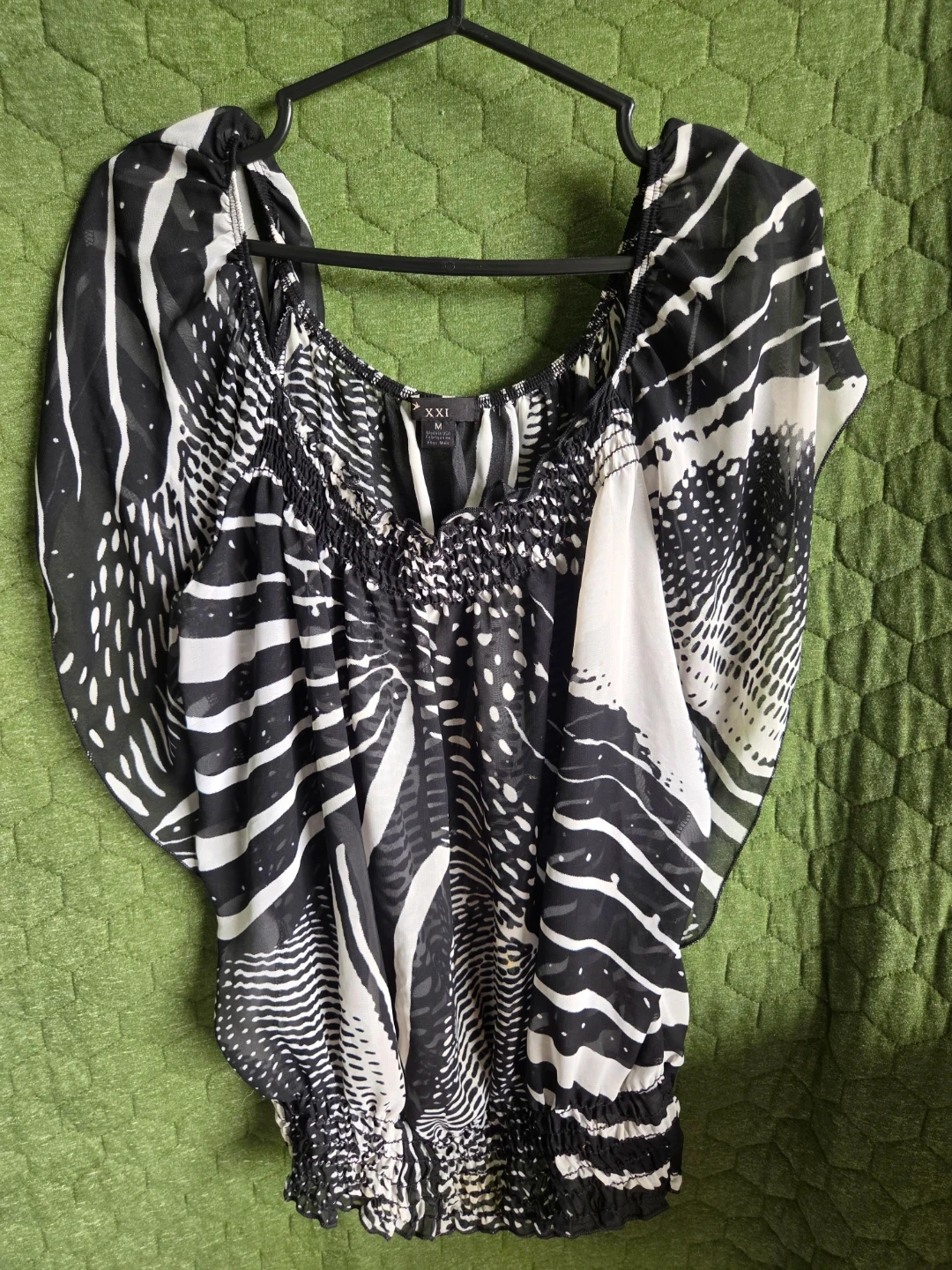 This is a sheer, black and white patterned blouse from XXI. It's a batwing style with a smocked hem and neckline. It features a unique abstract print all over.