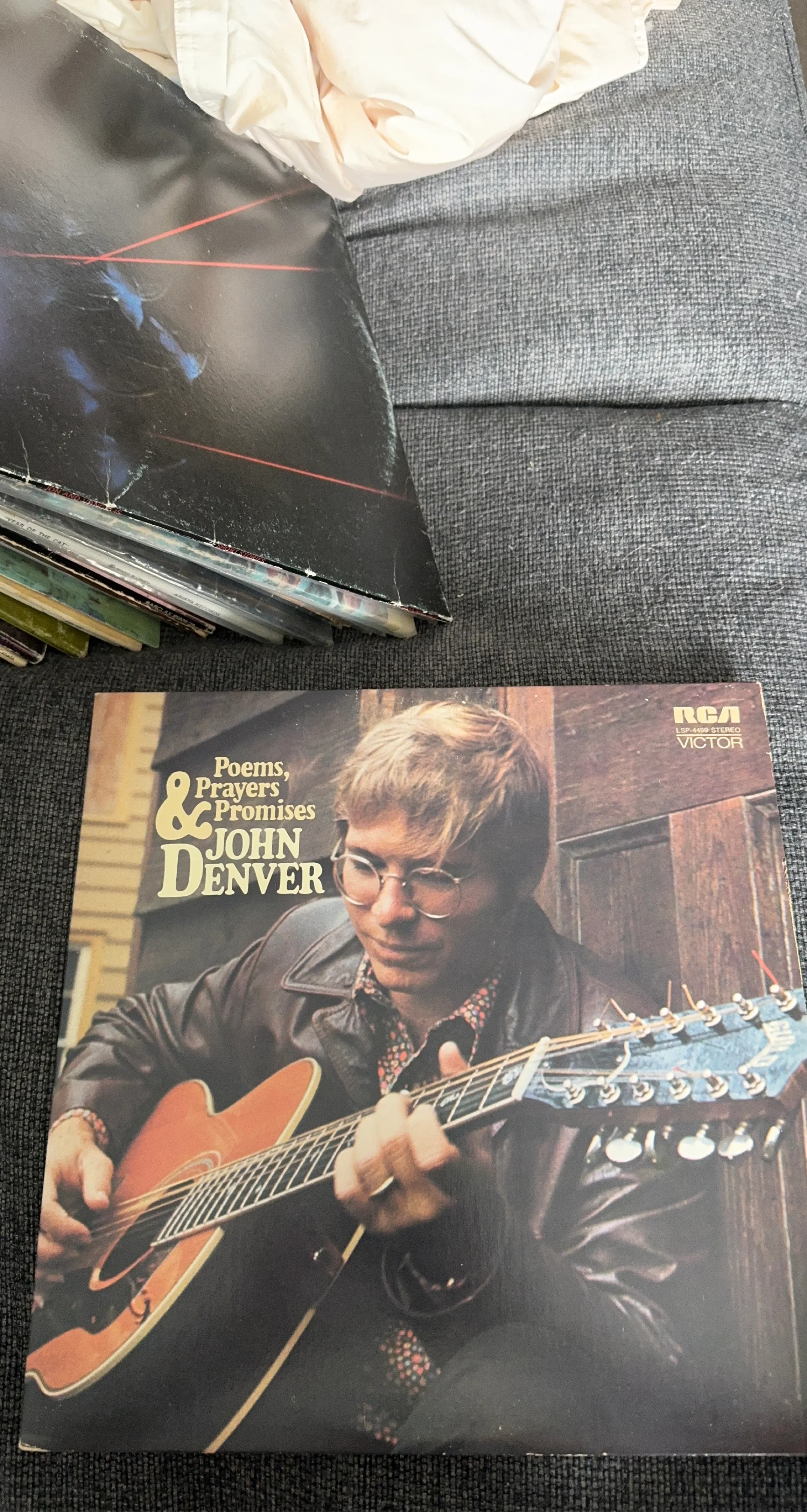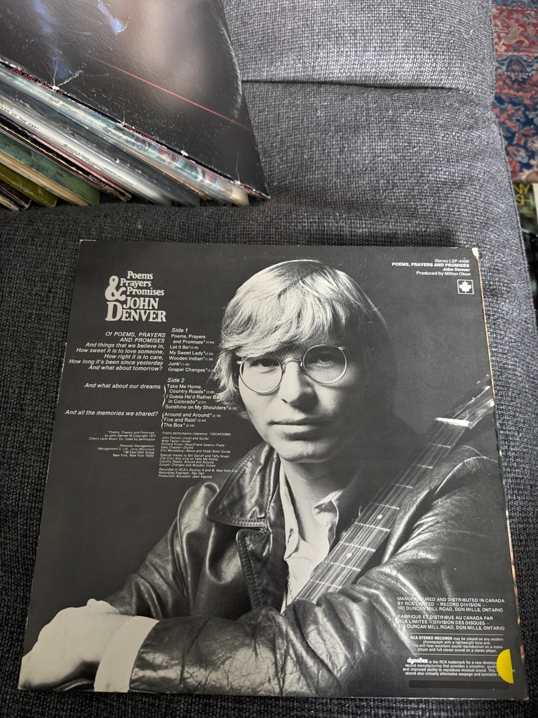 Poems, Prayers & Promises vinyl record by John Denver. Features songs like 'Take Me Home, Country Roads' and 'Rocky Mountain High'.