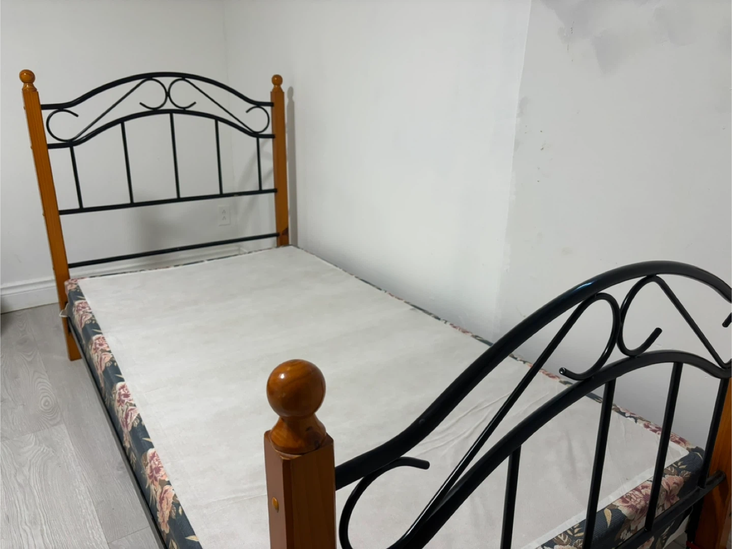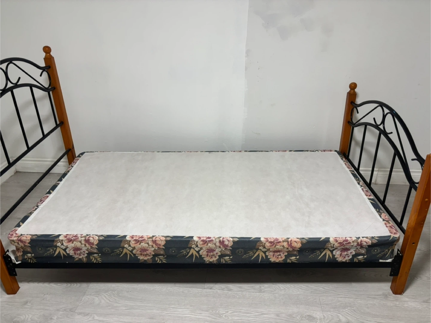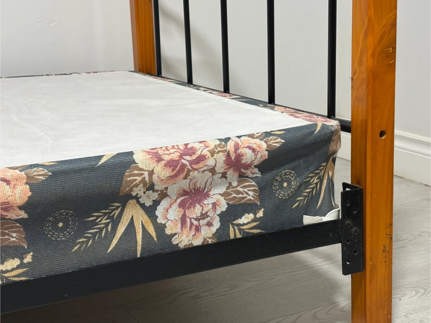 This twin bed frame features a combination of black metal and wood posts. It's covered with a floral-patterned box spring. Perfect for a child's room or guest bedroom!