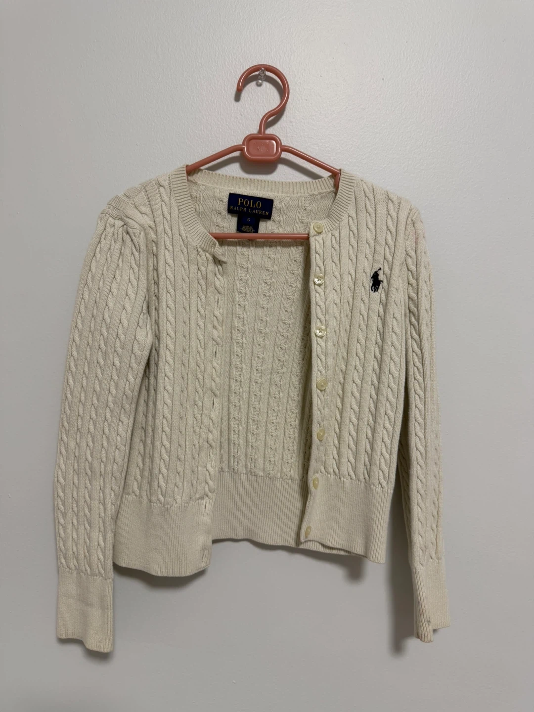 This is a cream-coloured cable knit cardigan from Polo Ralph Lauren. It features a button-up front and the signature embroidered pony logo. It's a size 6.