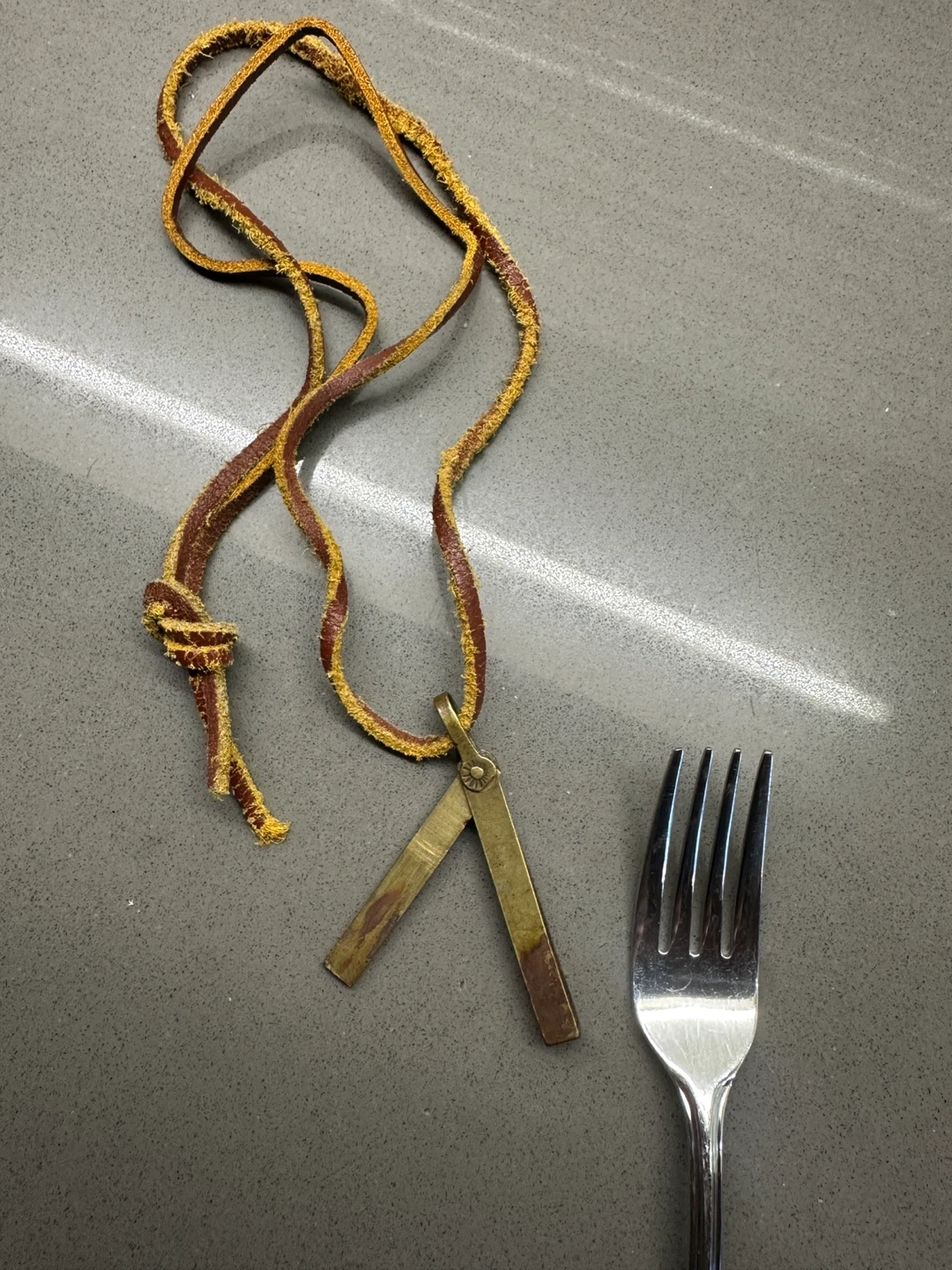 A beautiful and very interesting vintage hand made solid brass pendant necklace. Circa 1930’s. Center element swings out. Brass can be polished to a bright gold sheen if desired, but the aged patina is very nice.