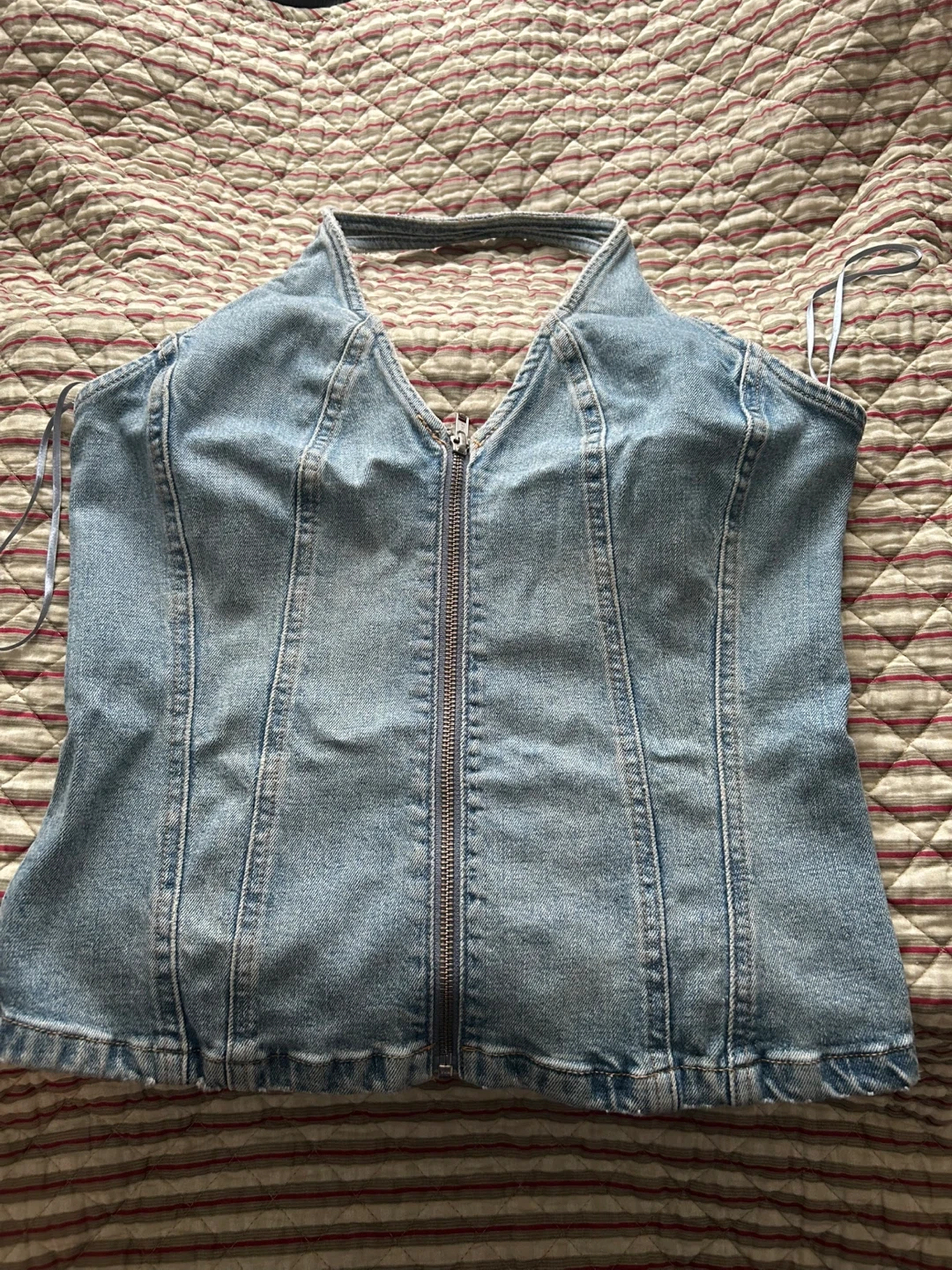 Unworn, new with tags Mango denim halter top, size large but fits more like a medium in my opinion. Wouldn’t recommend for anyone with a bigger bust :(.