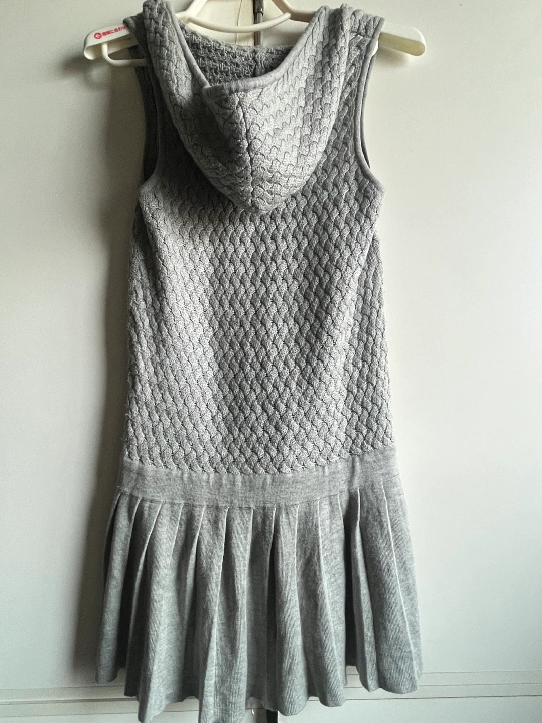 A sleeveless, grey knitted hooded dress from INGNI. It features a textured knit bodice and a pleated skirt with decorative buttons. Perfect for a casual yet stylish look!