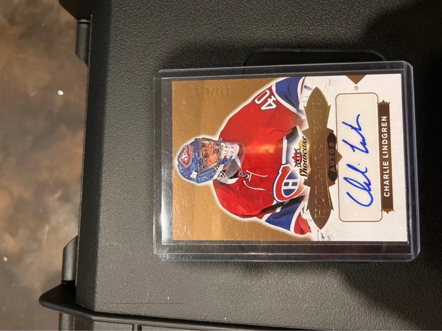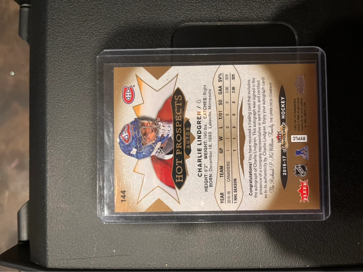 This is a 2016-17 Upper Deck hockey card featuring Charlie Lindgren. It's a "Hot Prospects Autos" card and includes his autograph. The card has a gold-coloured design.