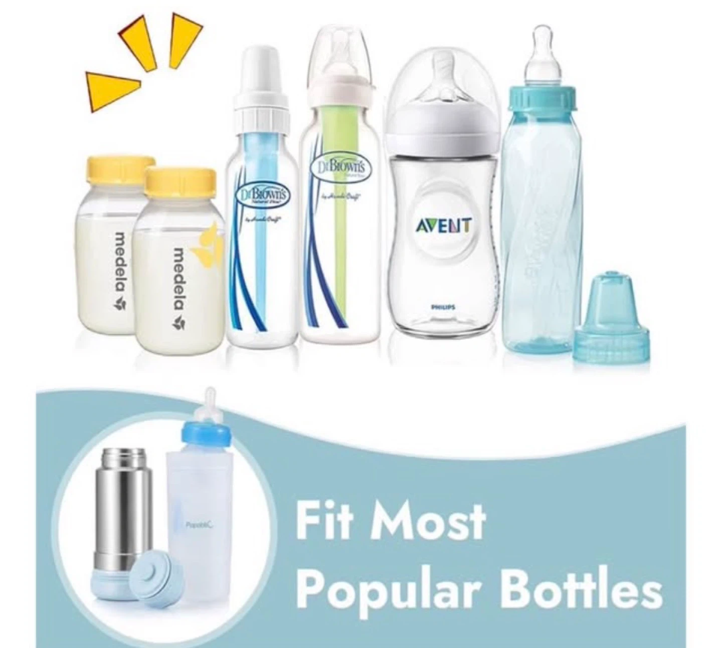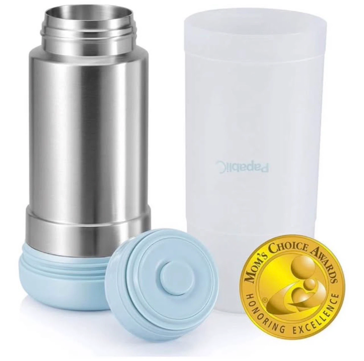 It's made of stainless steel (Free of chemicals and safe for your baby) and has a compact design that fits easily into a cup holder.