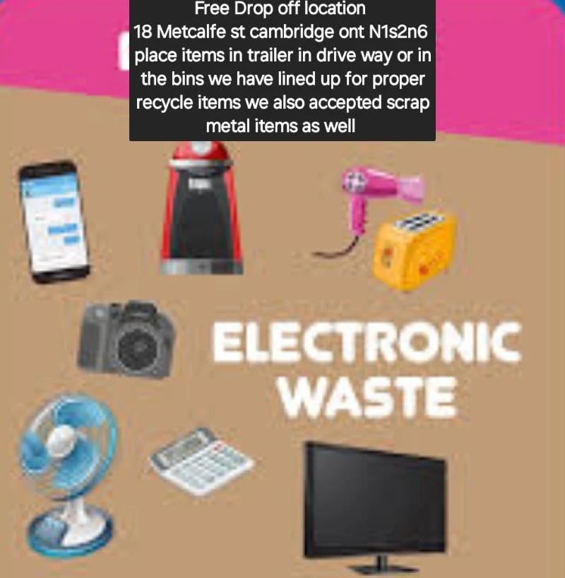 Free drop-off for electronic waste at 18 Metcalfe St, Cambridge, ON. Items can be placed in the trailer or bins provided for proper recycling. Scrap metal items are also accepted. This is a designated location for responsible disposal of electronics.