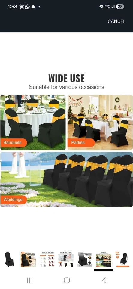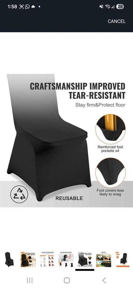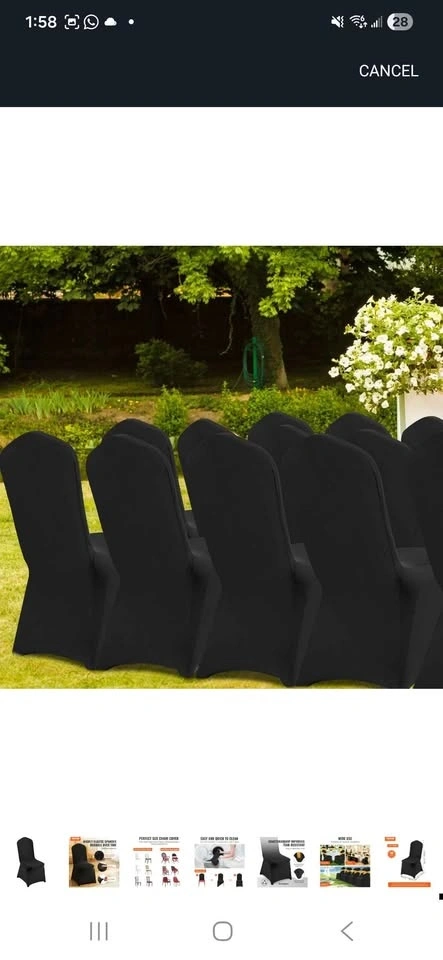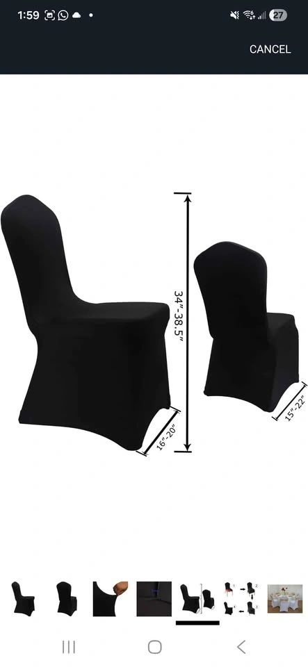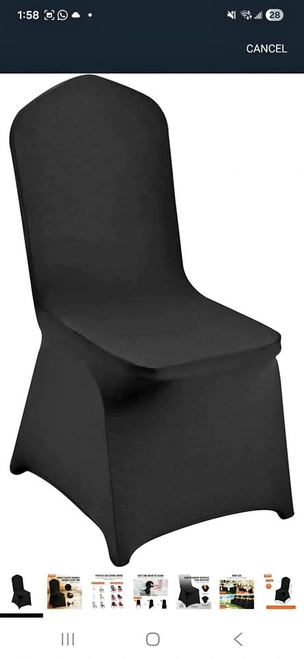 Black Stretch Spandex Chair Covers, 22 PCS. Perfect for banquets, parties, or any dining event. Universal fit. These are premium scuba elastic covers. Used only 4 to 5 covers, so they are almost brand new. Selling each for $2, or make a deal to take all 22. From a pet-free and smoke-free home.