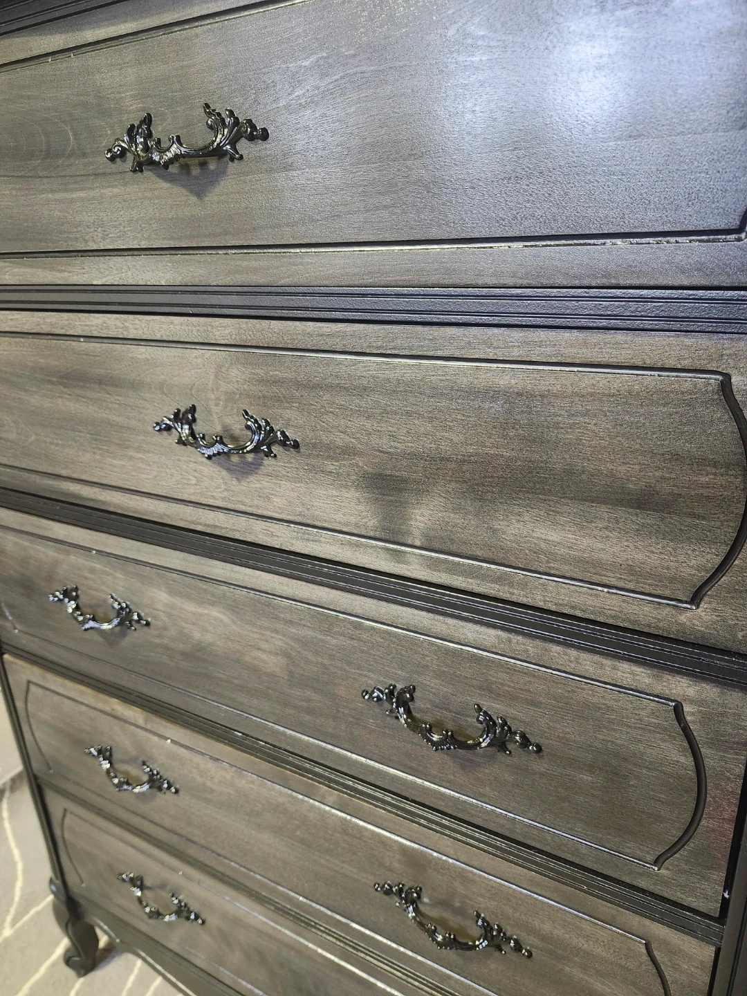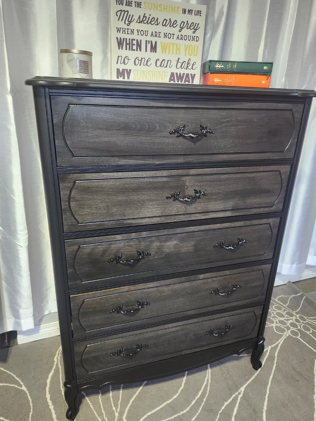 This dresser has a dark wood finish with ornate black hardware. It features five spacious drawers for storage. The top and frame are a matte black, contrasting with the stained maple wood drawer fronts. All drawers slide perfectly. Delivery can be arranged