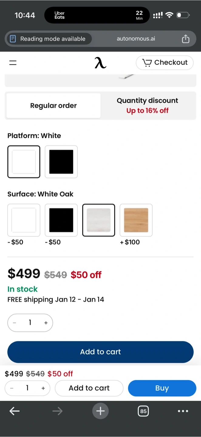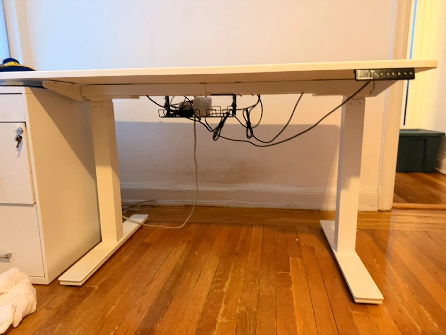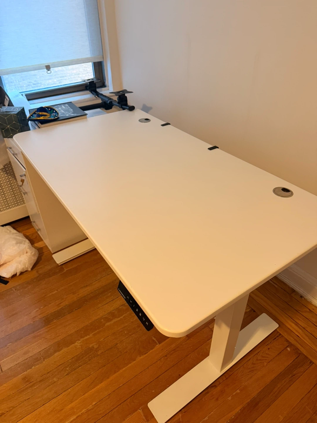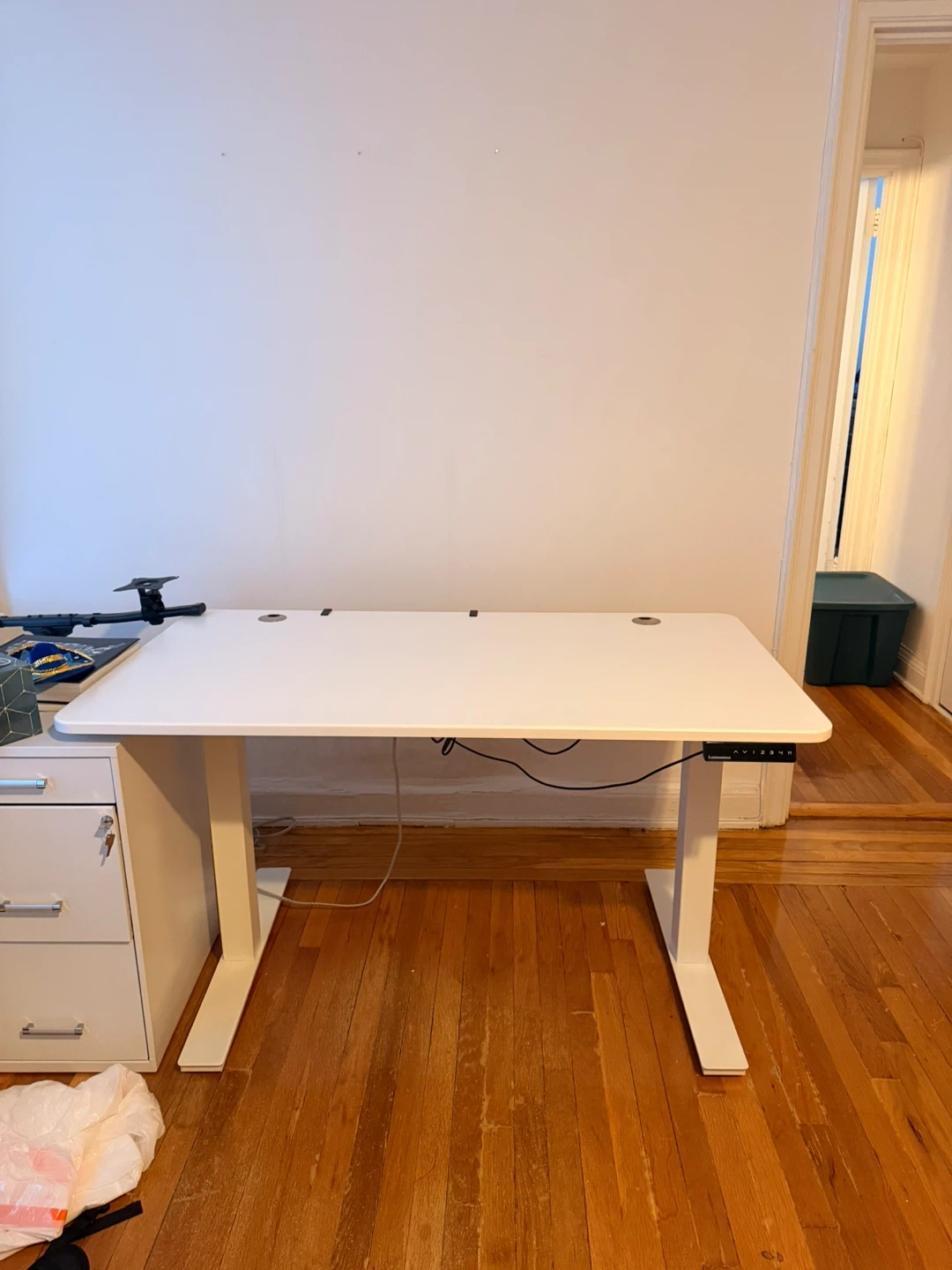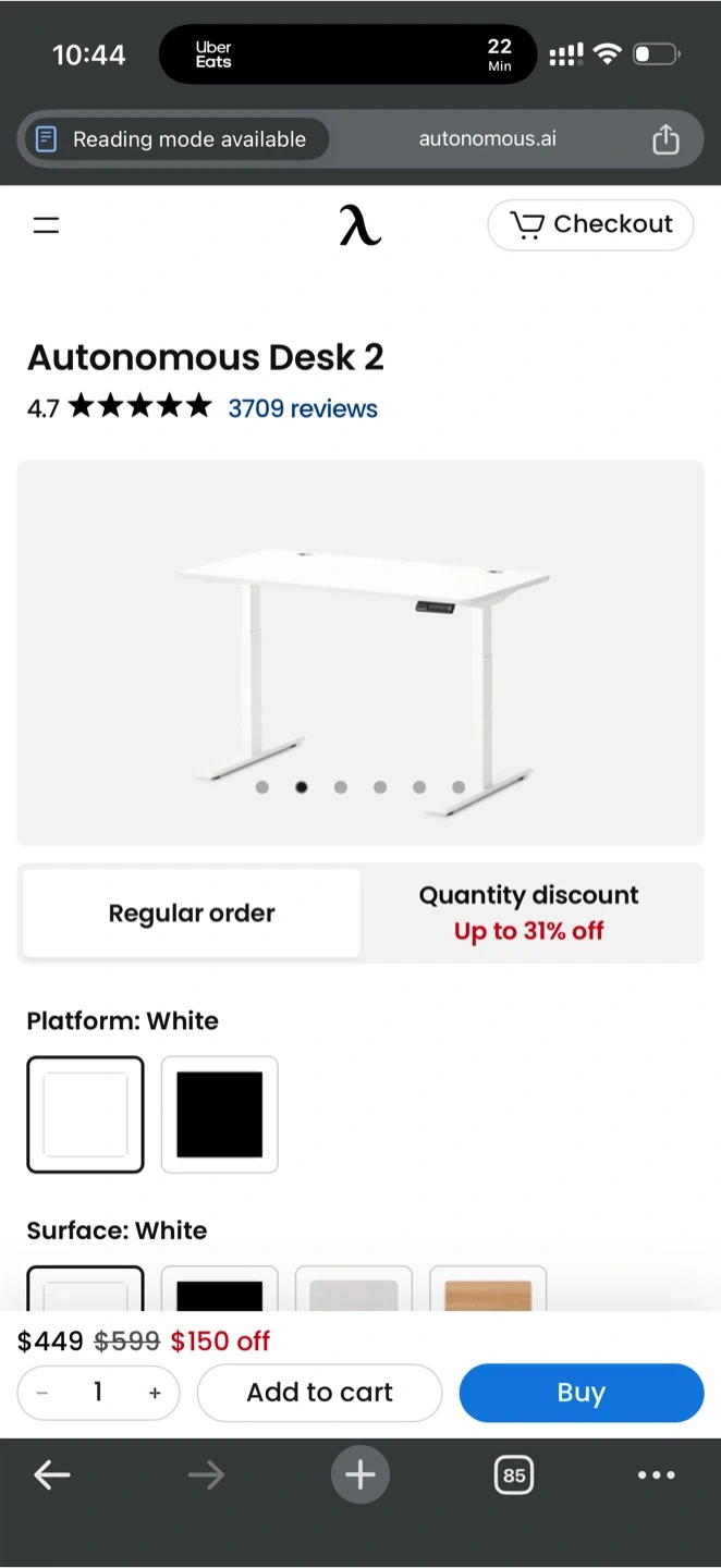 This is an Autonomous electric standing desk. It's white with a white oak surface. The desk features a programmable control panel for height adjustment.