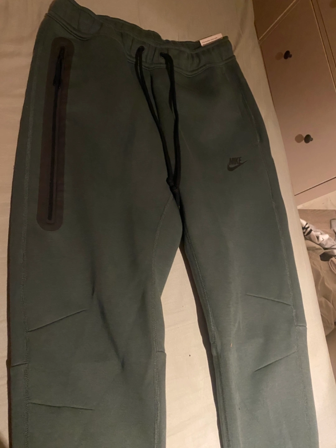 Selling a pair of Nike Tech Fleece pants in olive green. They have a slim fit and a comfortable feel. Perfect for lounging or working out!