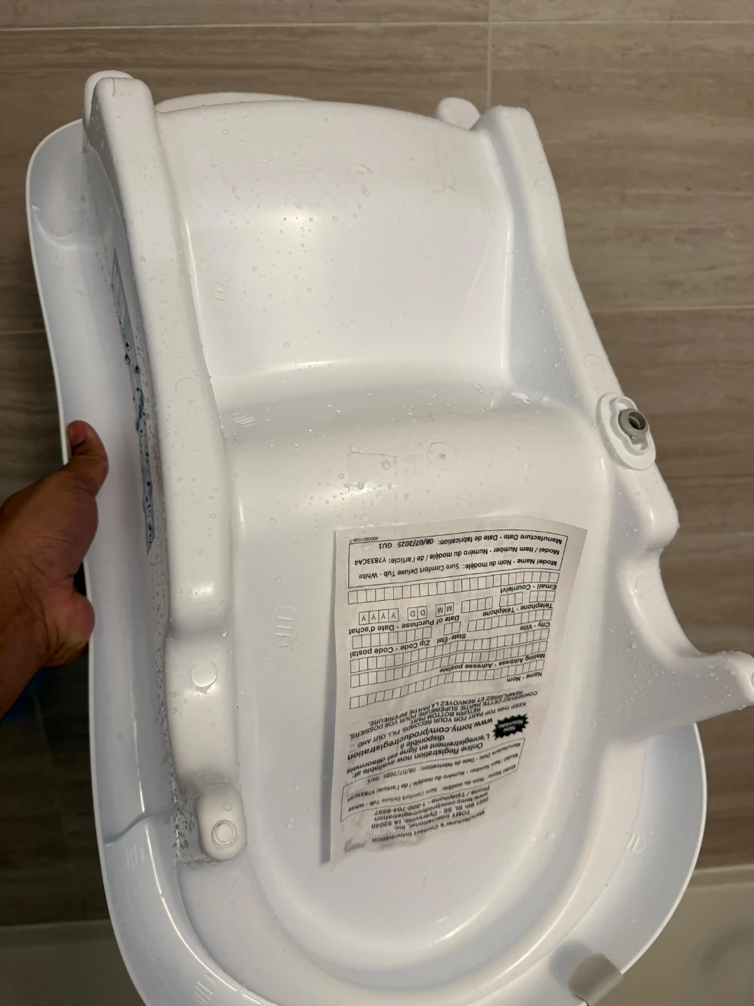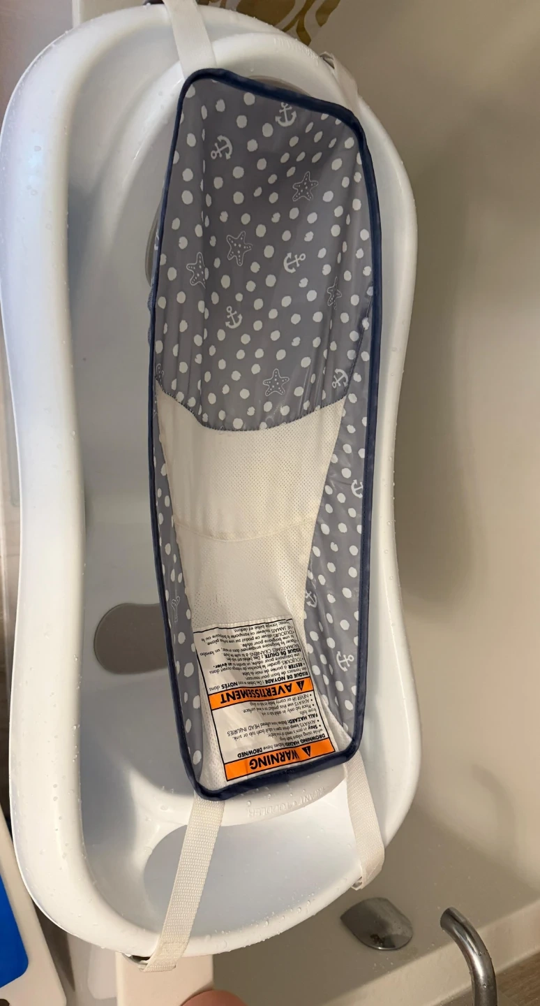 This white baby bath tub comes with a supportive sling for newborns. It's designed for safe and comfortable bathing. This tub is great for babies from birth up to 6 months.