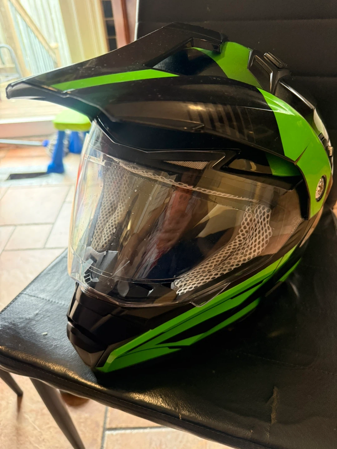 This is a black and green motorcycle helmet. It has a clear visor and a peak. It's ready for your next ride! Dual Visor READY FOR SPRING RIDE!