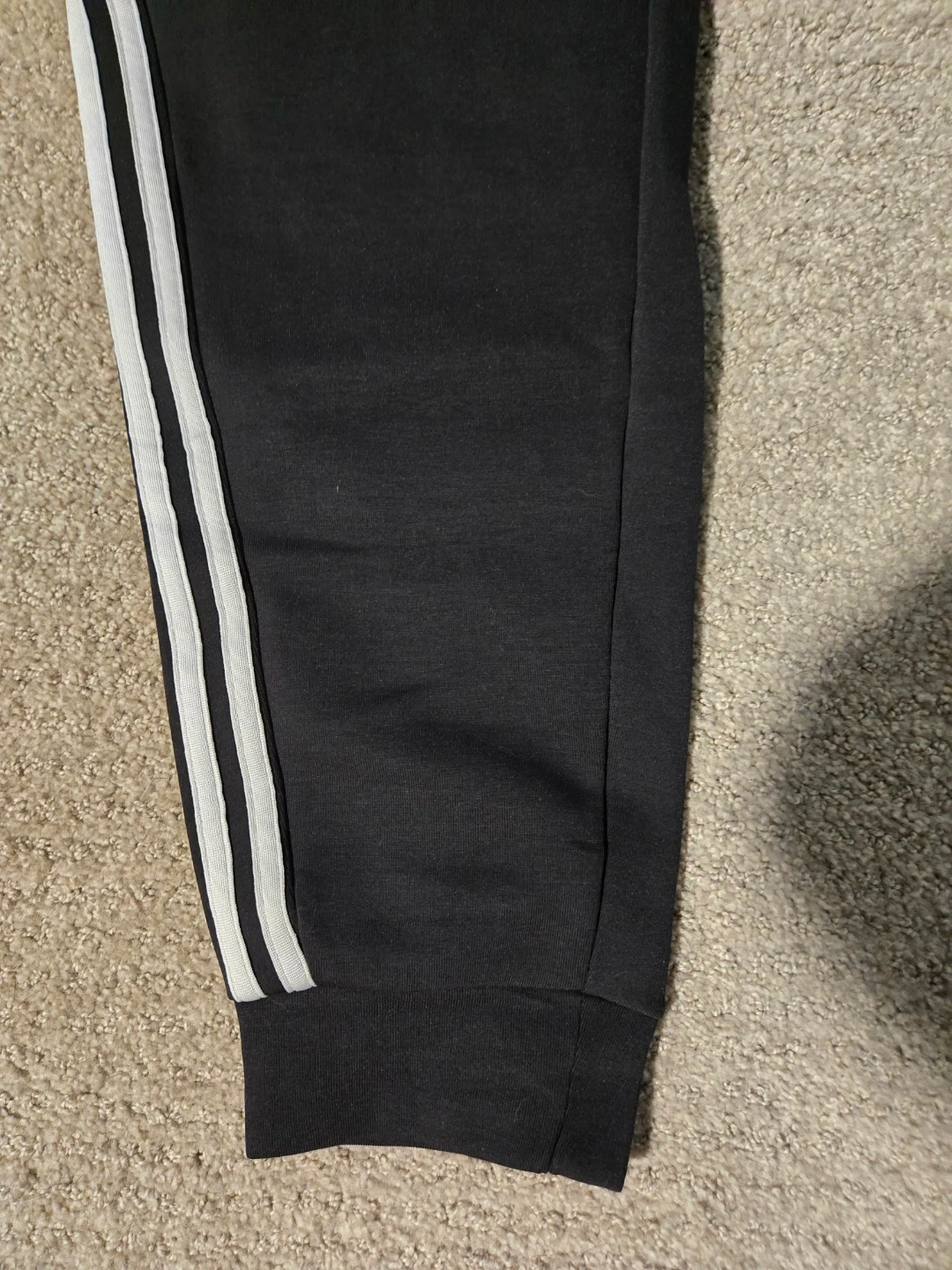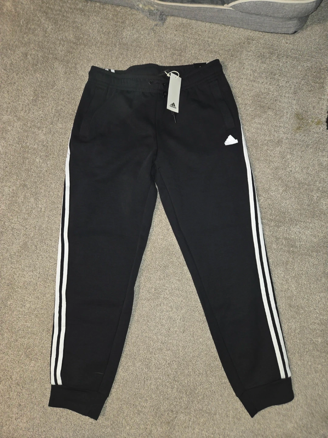 These are Adidas black pants with a regular fit and tapered leg. They feature the classic three stripes. Made for full-length style.