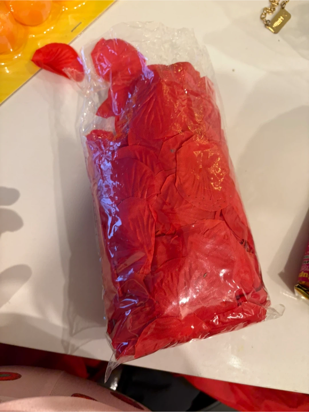 Bag of red rose petals. They're perfect for decorating events or crafts! Use them for weddings, parties, or just to add a touch of romance. Made of fabric.
