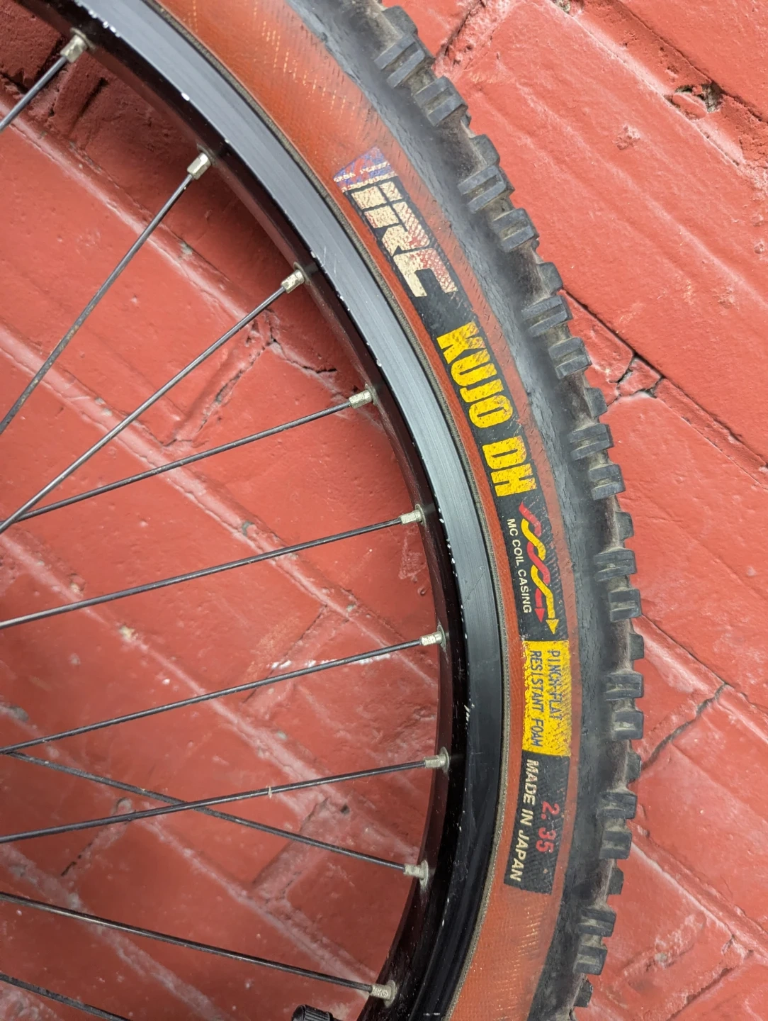 Tires: IRC Kujo DH (26 x 2.65" Front / 24 x 2.35" Rear). These are legendary vintage skinwall tires with massive knobs and "Pinch-Flat Resistant" technology.