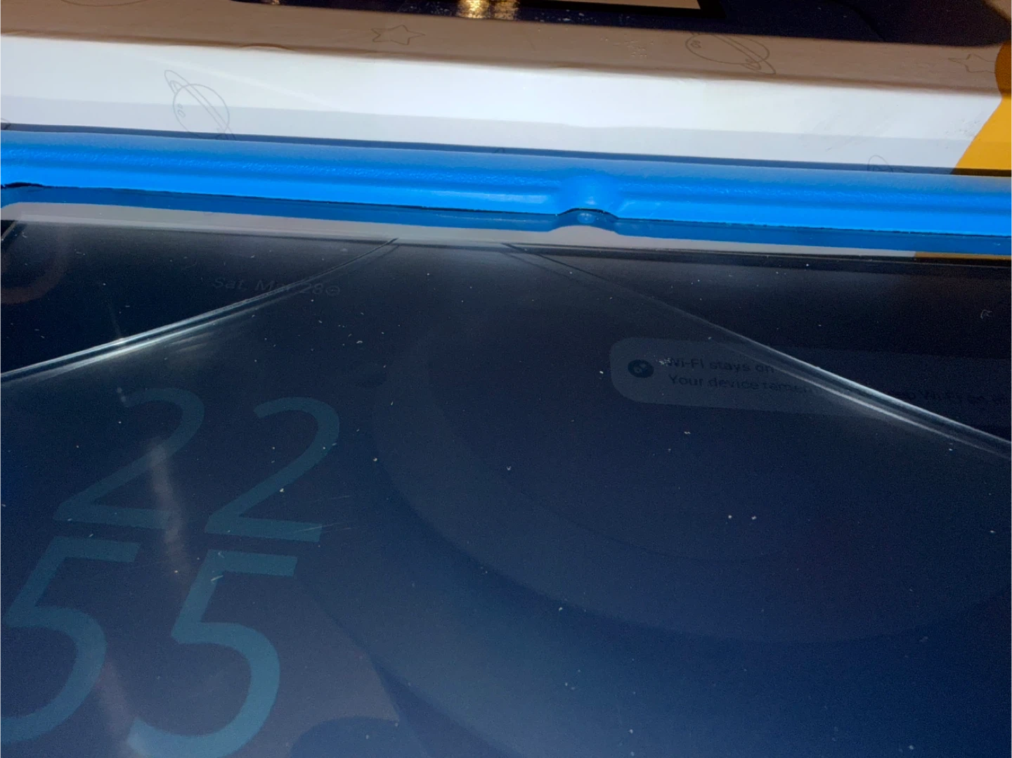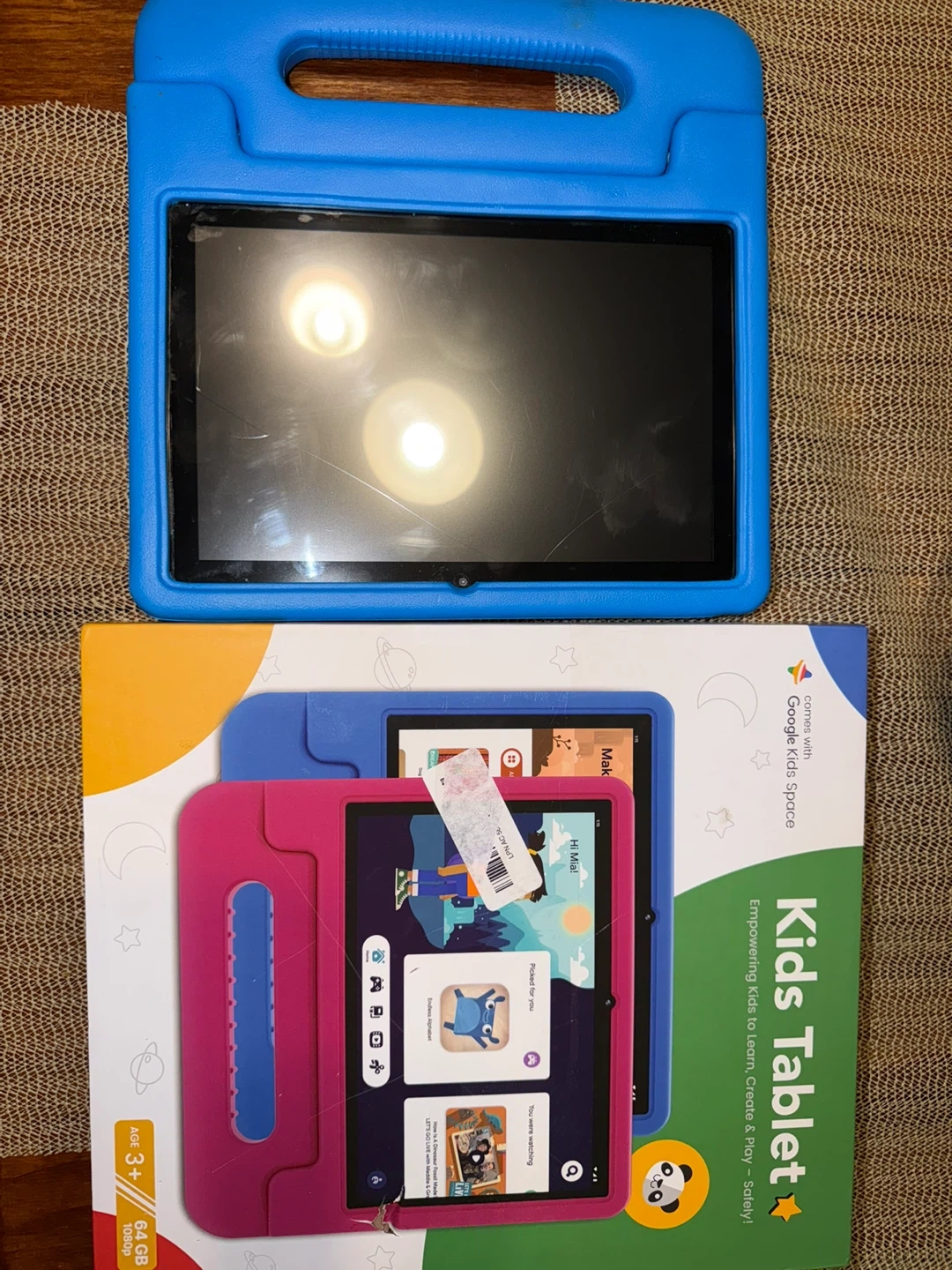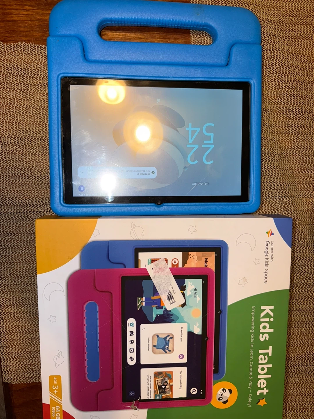 This kids tablet comes with a durable blue bumper case, providing protection for young users. It's designed for children's use with interactive features. The tablet comes with its original box. Age 3+.