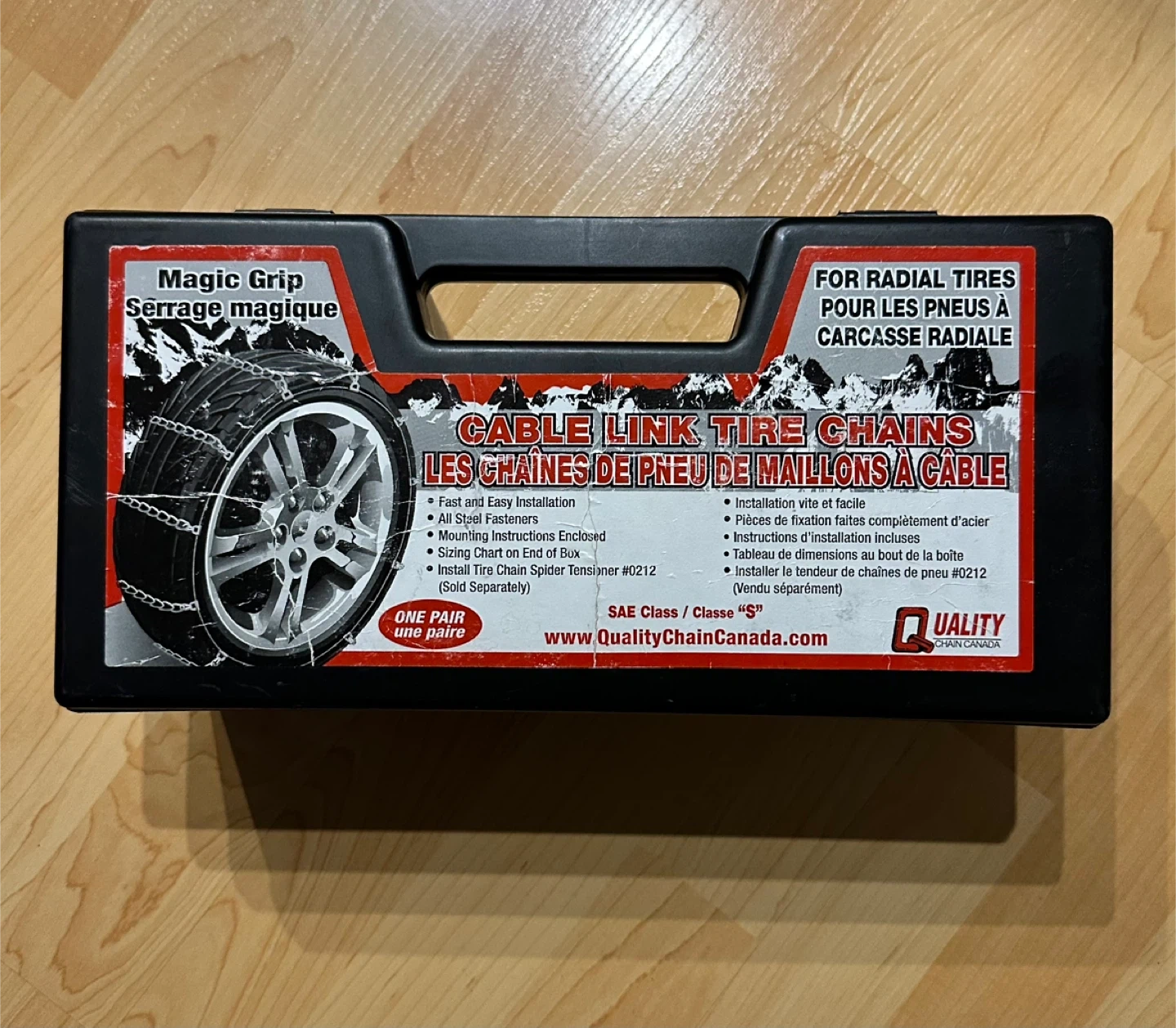 Brand new Quality Chain Canada “Magic Grip” (#1938) cable-style tire chains. Chains have never been unraveled or used. They are designed for both radial and regular tires and provide reliable traction on snow and ice. Suitable for passenger vehicles. Instructions are enclosed for easy installation.