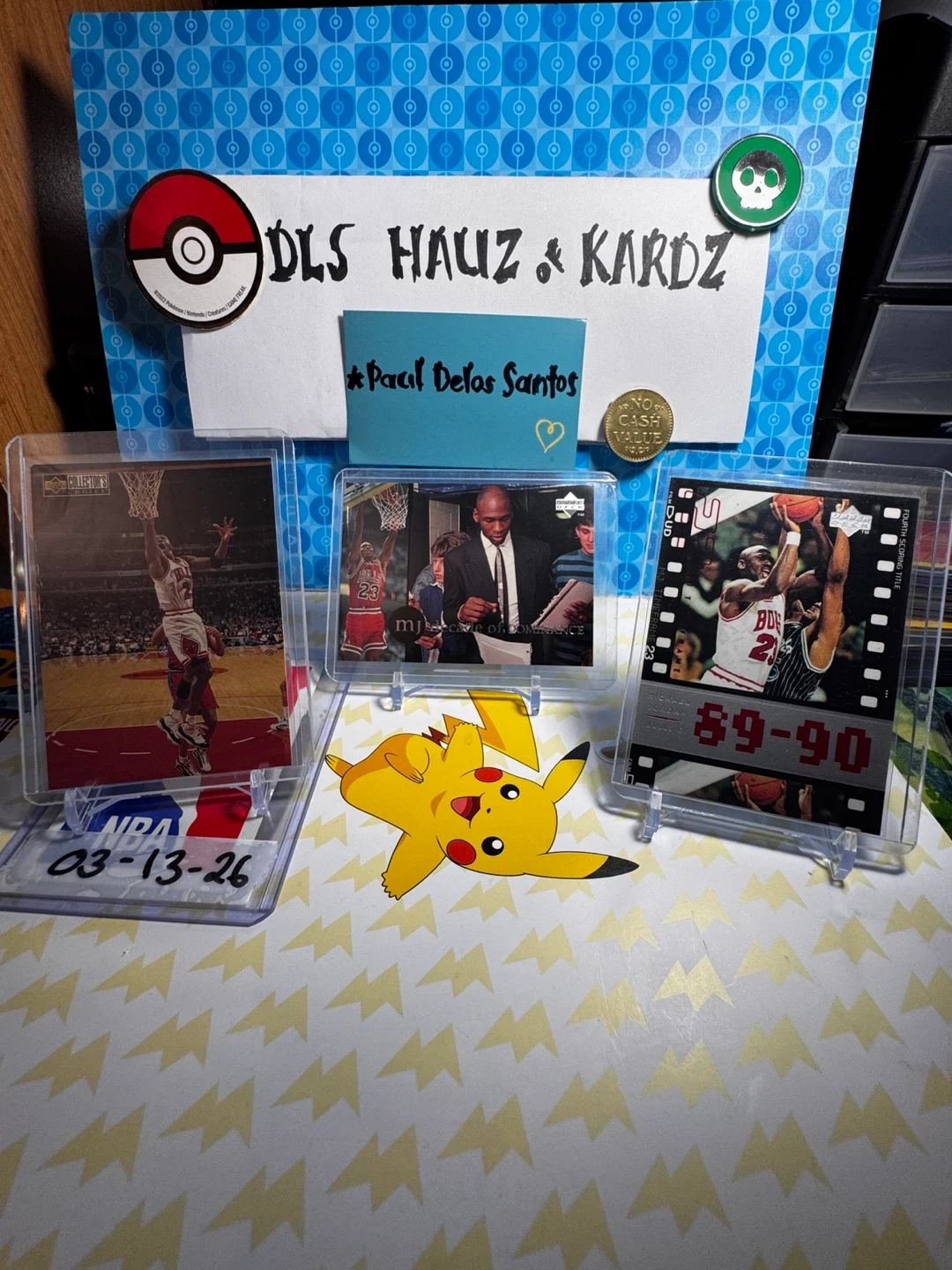 Collection of three Michael Jordan NBA trading cards. Features a 'Collector's Choice' card, a 'Decade of Dominance' card, and a 'Fourth Scoring Title' card from the '89-'90 season. Cards are in protective sleeves.