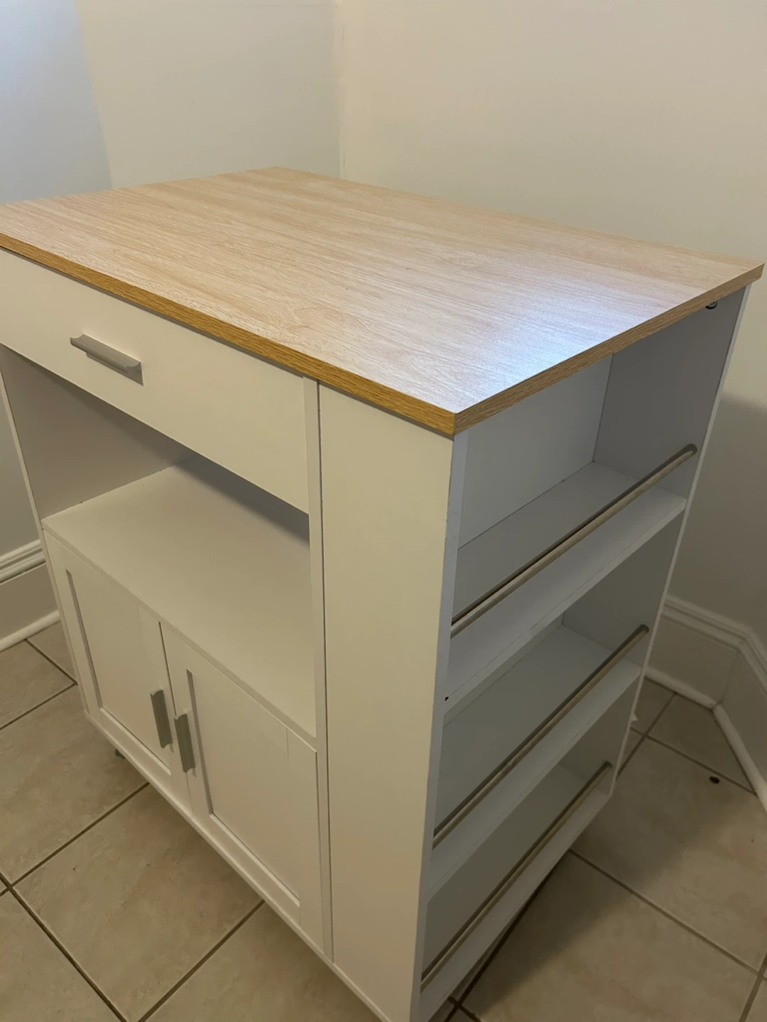 Kitchen cart with cabinet, drawer, open shelf and spice racks.