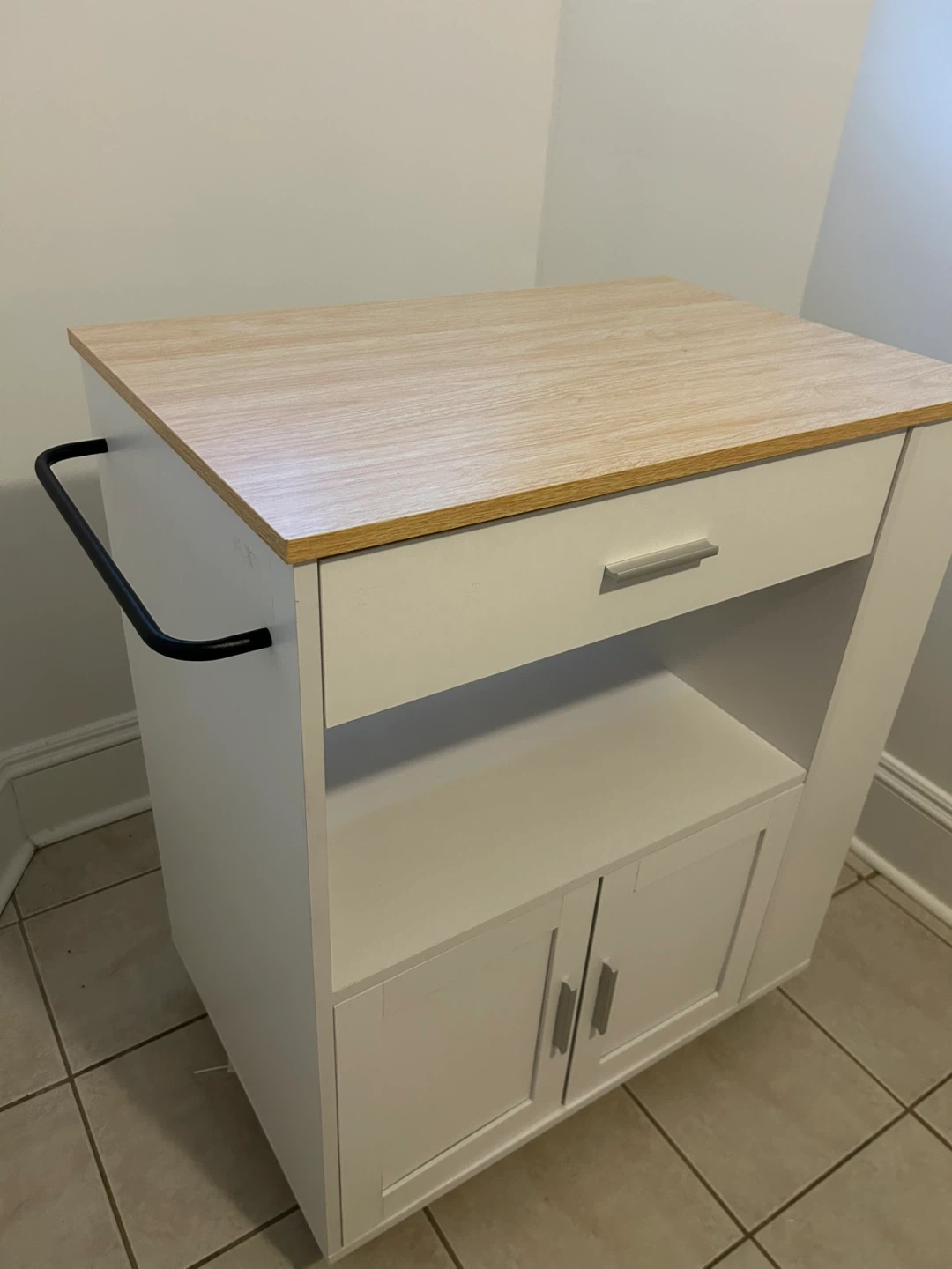 Giantex White kitchen cart with a wood-look top. It features one drawer, a cabinet with doors, and open shelving on the side. It has a towel rack attached to one side.