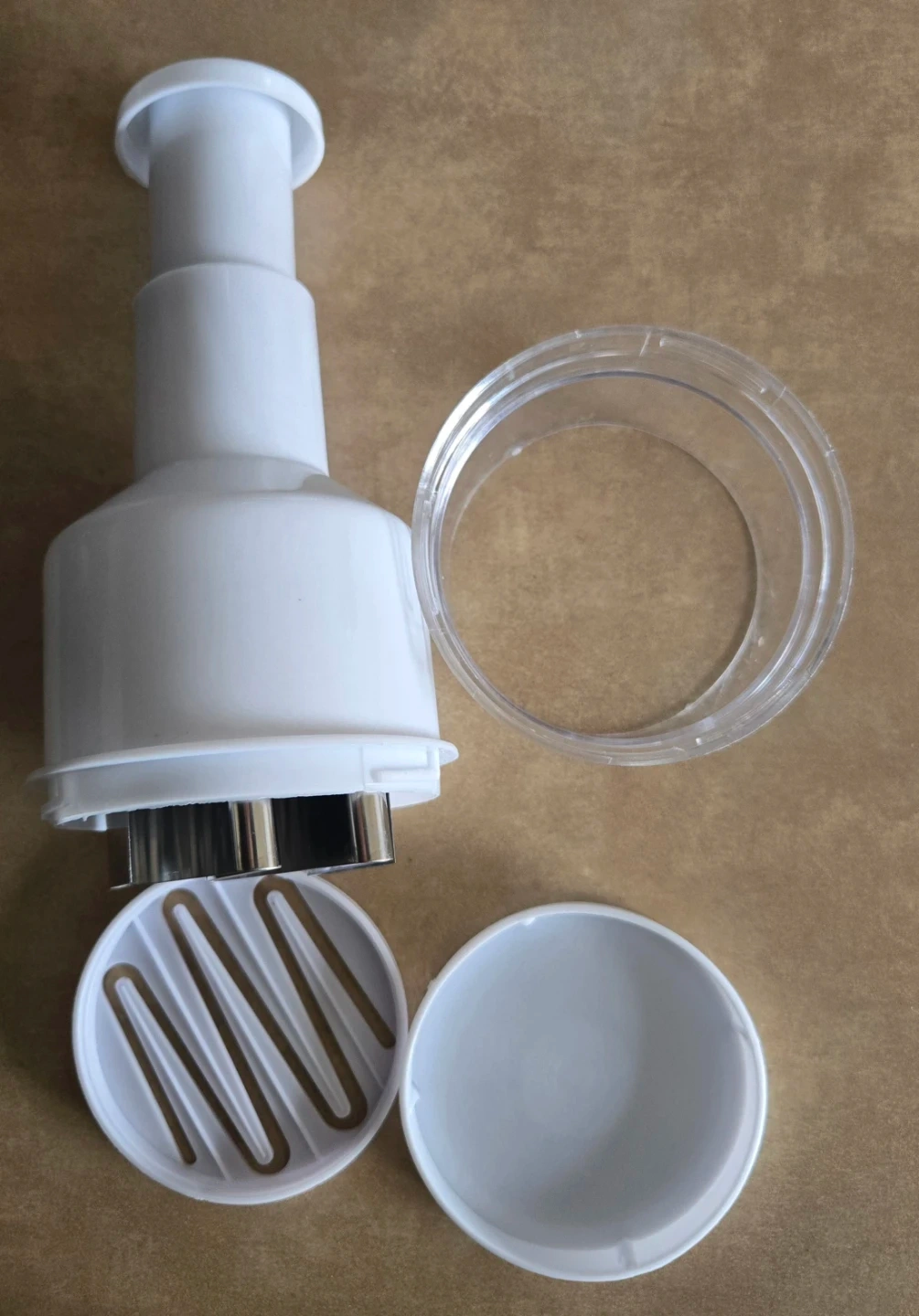 This white manual food chopper is designed for quick dicing. It includes a base and a clear collection container. This kitchen tool is handy for preparing ingredients efficiently! Used only once. Selling as I don't use it enough and decluttering. Cash only. Pick up Signal Hill.