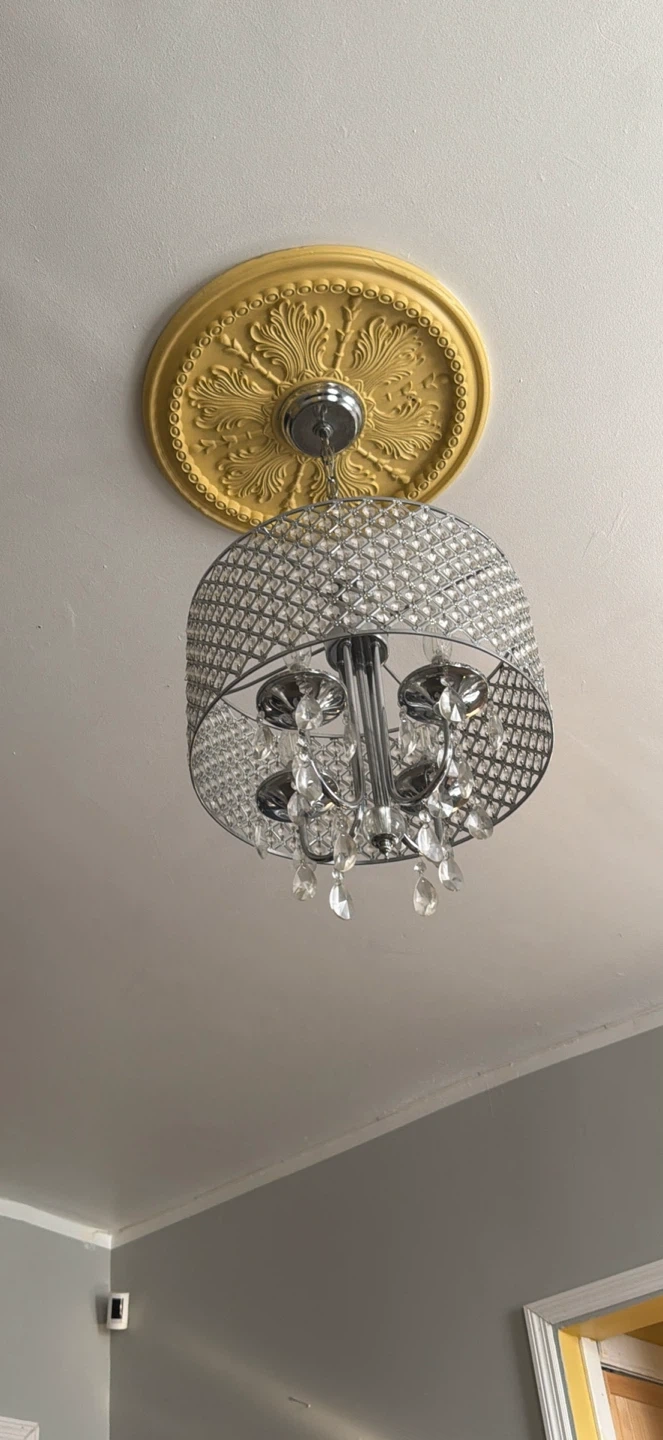 This elegant drum chandelier features a diamond lattice pattern with sparkling crystal accents. It has four light sockets and decorative crystal drops for added flair. The metal finish is a dark gray, complementing the silver-toned crystals. Adds a touch of glamour to any room!