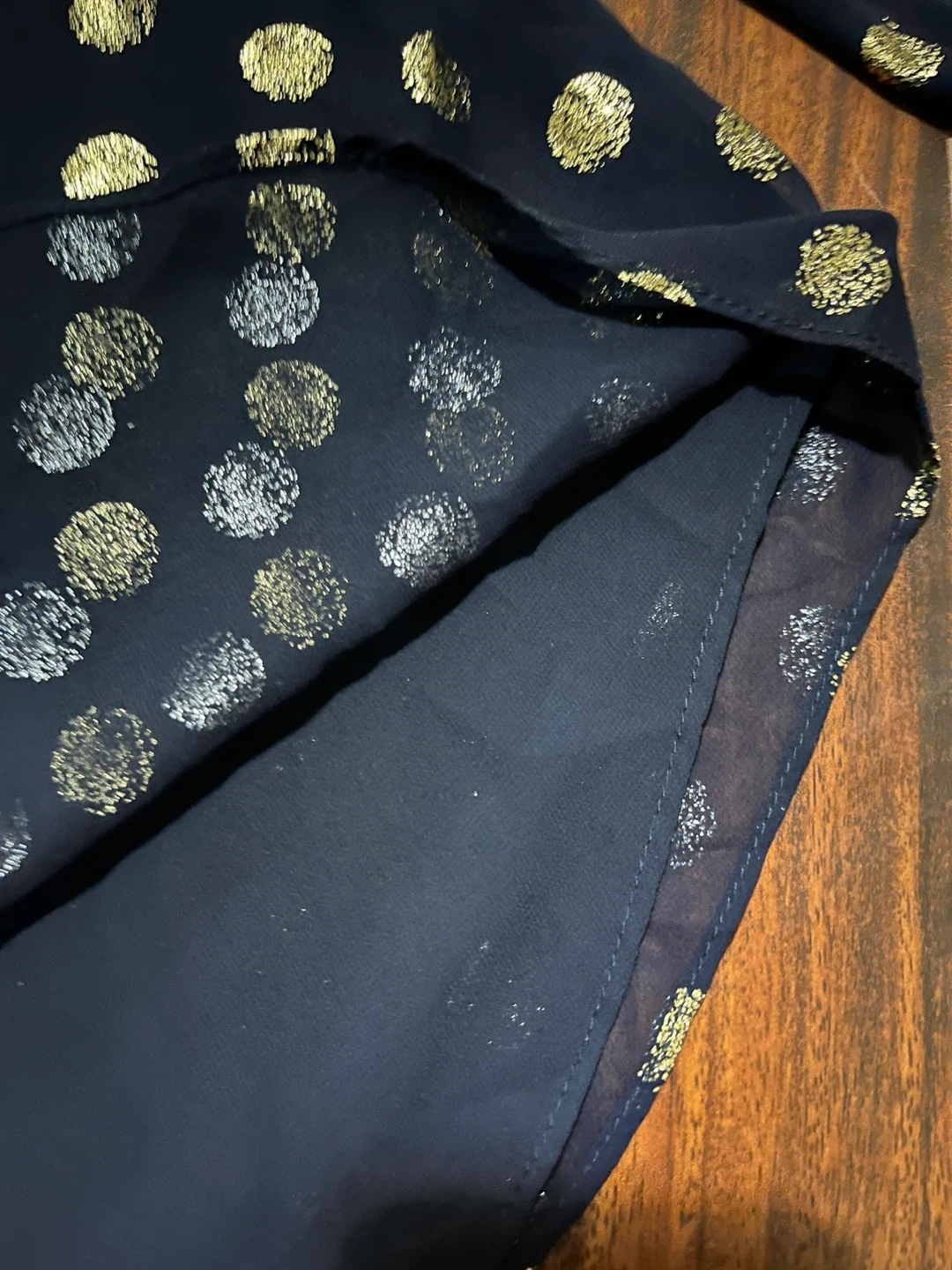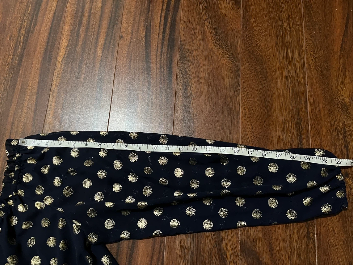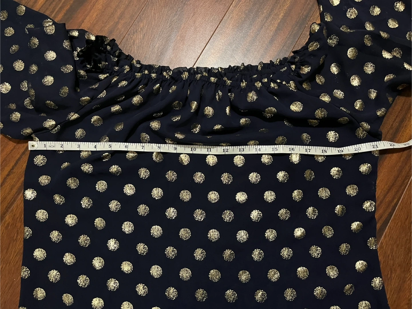 Authentic Joseph Ribkoff women’s blouse in midnight blue with gold polka dots. New without tags! Elasticized ruffle neckline allows off-the-shoulder wear. Semi-sheer fabric with curved hem and long blouson sleeves. Made in Canada. Generous size six fit.