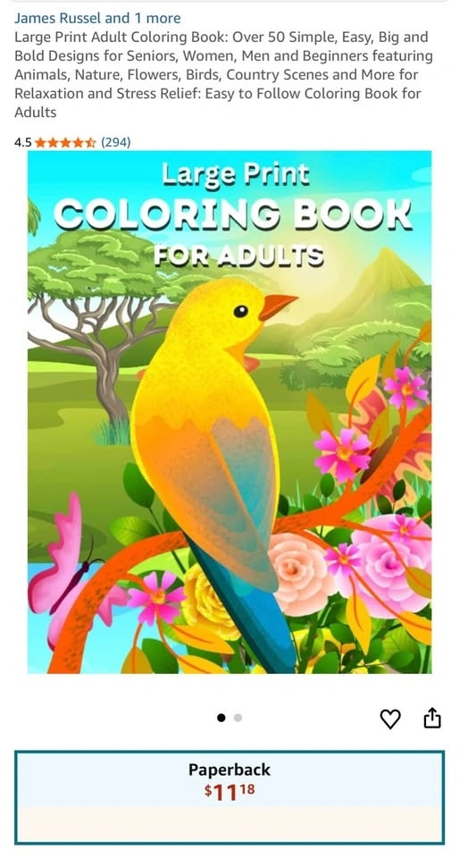 Over 50 Simple, Easy, Big and Bold Designs for Seniors, Women, Men and Beginners featuring Animals, Nature, Flowers, Birds, Country Scenes and More for Relaxation and Stress Relief. Let me know if you're interested!