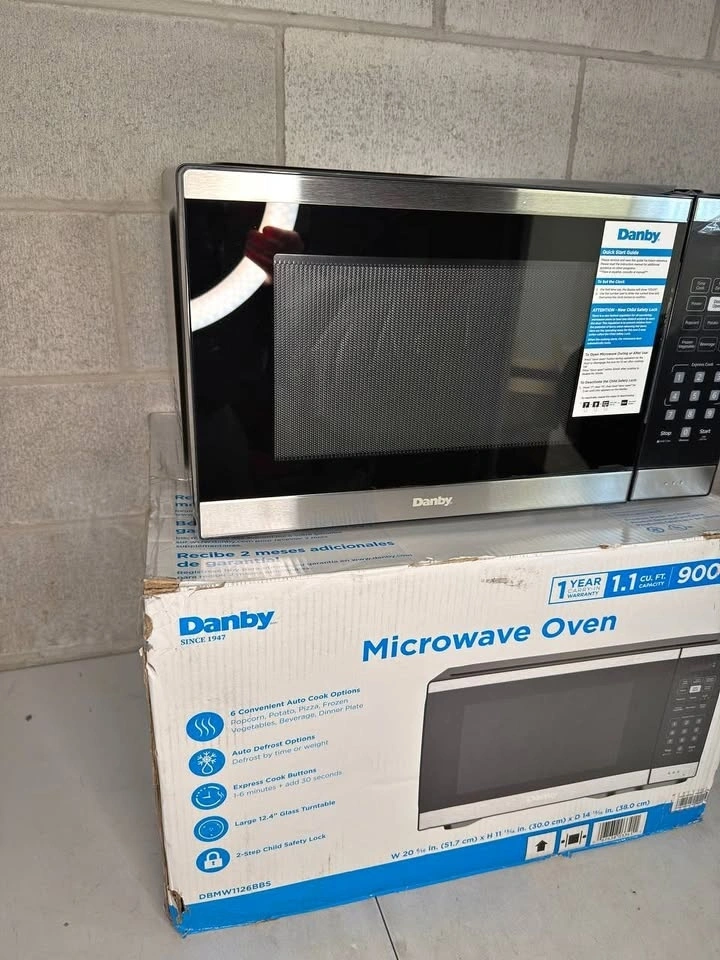 Danby 1.1 cu. ft. countertop microwave offers 900W power with 10 adjustable levels for everyday cooking and reheating. Measuring 38 Γ 51.7 Γ 30 cm, it features six one-touch auto-cook presets, express cook options, defrost functions, and a sleek stainless steel finish ideal for kitchens, condos, or offices.