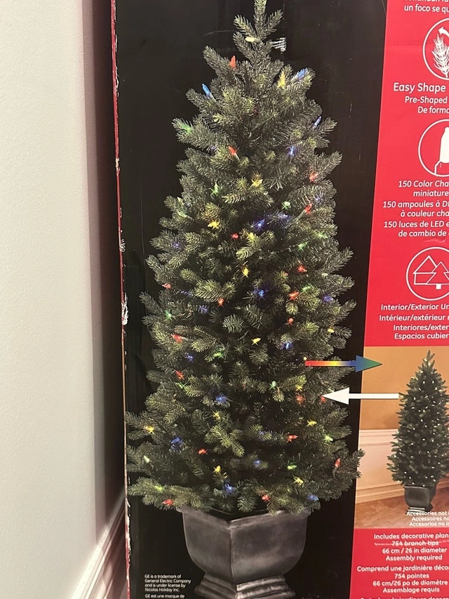 Create a festive ambiance with this Norway Spruce Just Cut 4.5-foot artificial Christmas tree. It features colour choice LED lights, easy shape pre-shaped construction, and a sturdy decorative pot. The tree is in used but great condition, ready to brighten up your holiday season!
