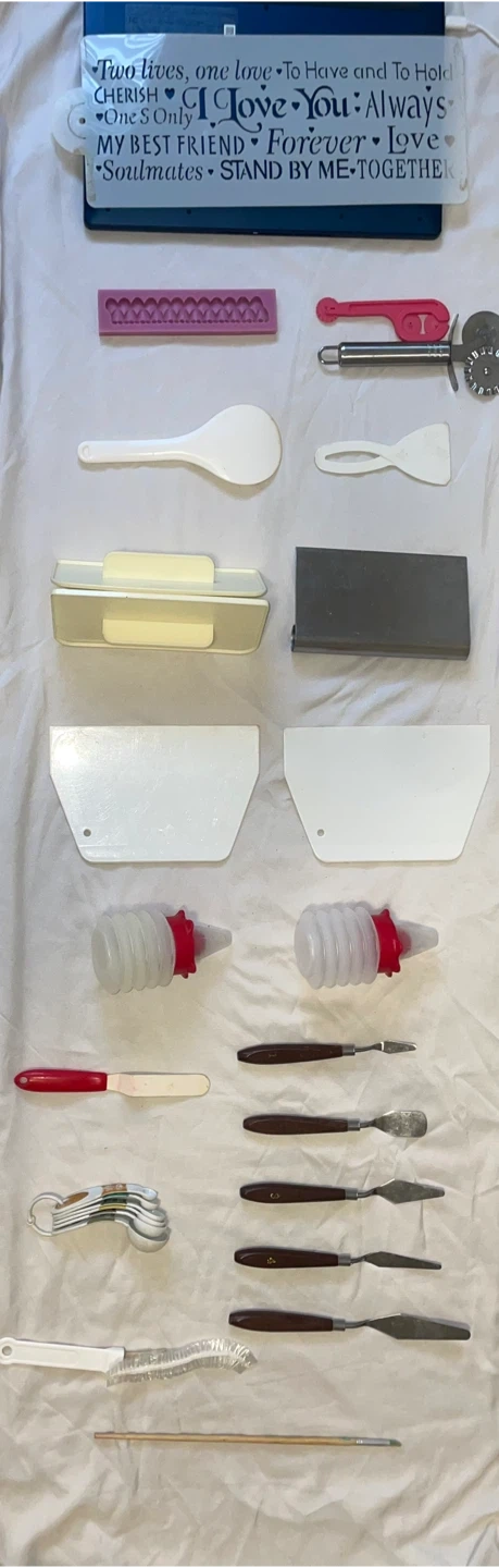 BRING YOUR ART TO LIFE!….. This set includes various tools for baking and decorating. It features a silicone mould, dough scraper, icing spatulas, and a pizza cutter. Also included are some smaller decorating tools and a stenciling item.