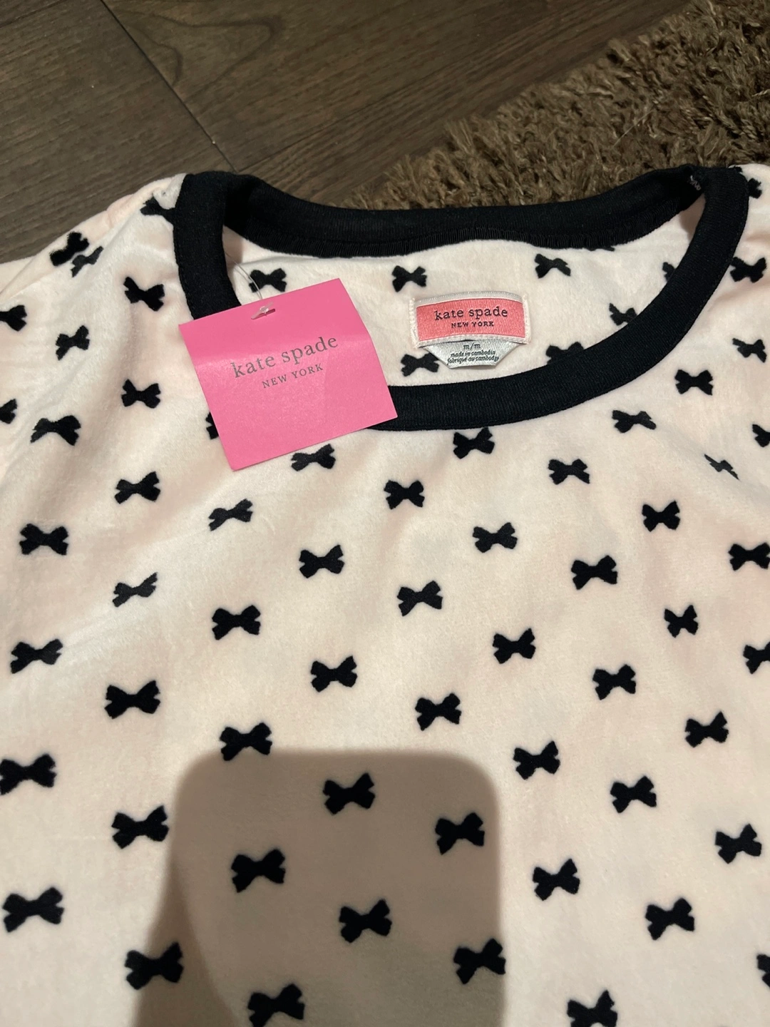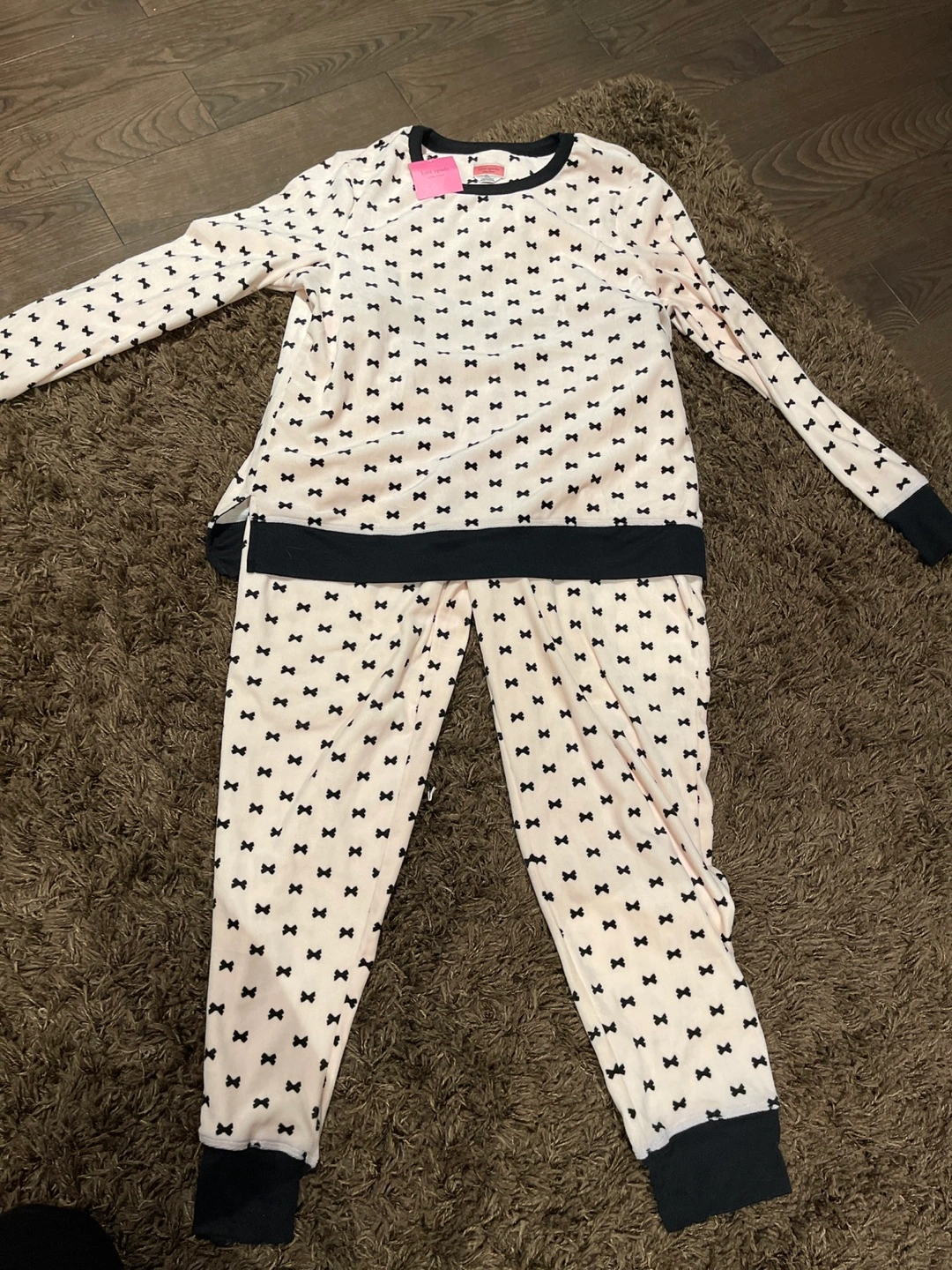 Adorable pajama set. Long-sleeved top and matching pants. Soft fabric. Black bows on a light pinkbackground. Size Medium. New with tags.