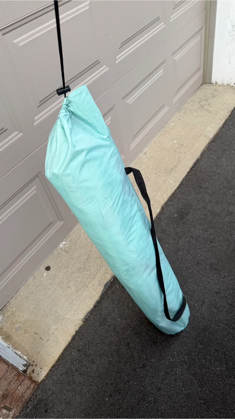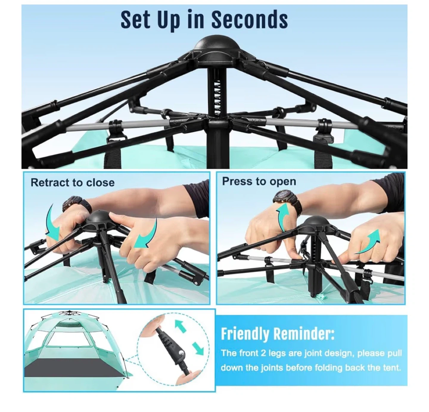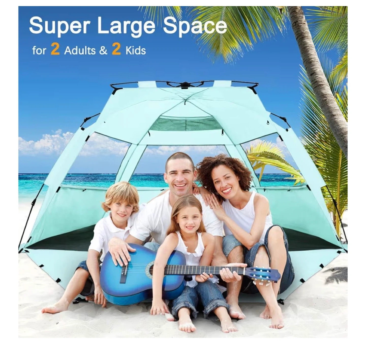 This light blue beach tent comfortably fits 4 people. It's easy to set up in seconds and has a 99" x 55" floor. Comes with 6 plastic stakes, 8 steel stakes, and 4 guy lines for secure setup.