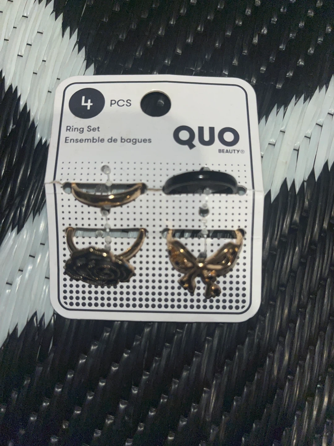 This is a 4-piece ring set from QUO Beauty. It includes two plain bands and two decorative rings, one with a rose design and another with a bow. These rings are great for adding a touch of style to any outfit!