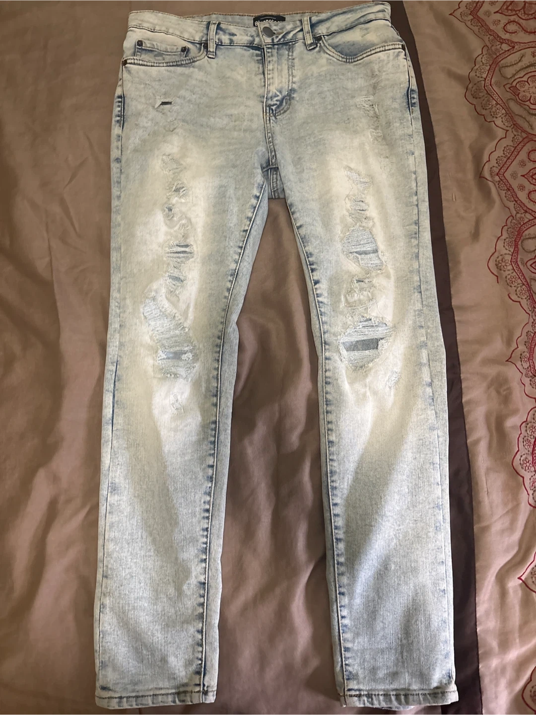These jeans with an acid wash finish and distressed rips. They're a light blue colour. They are a stylish addition to any casual outfit!