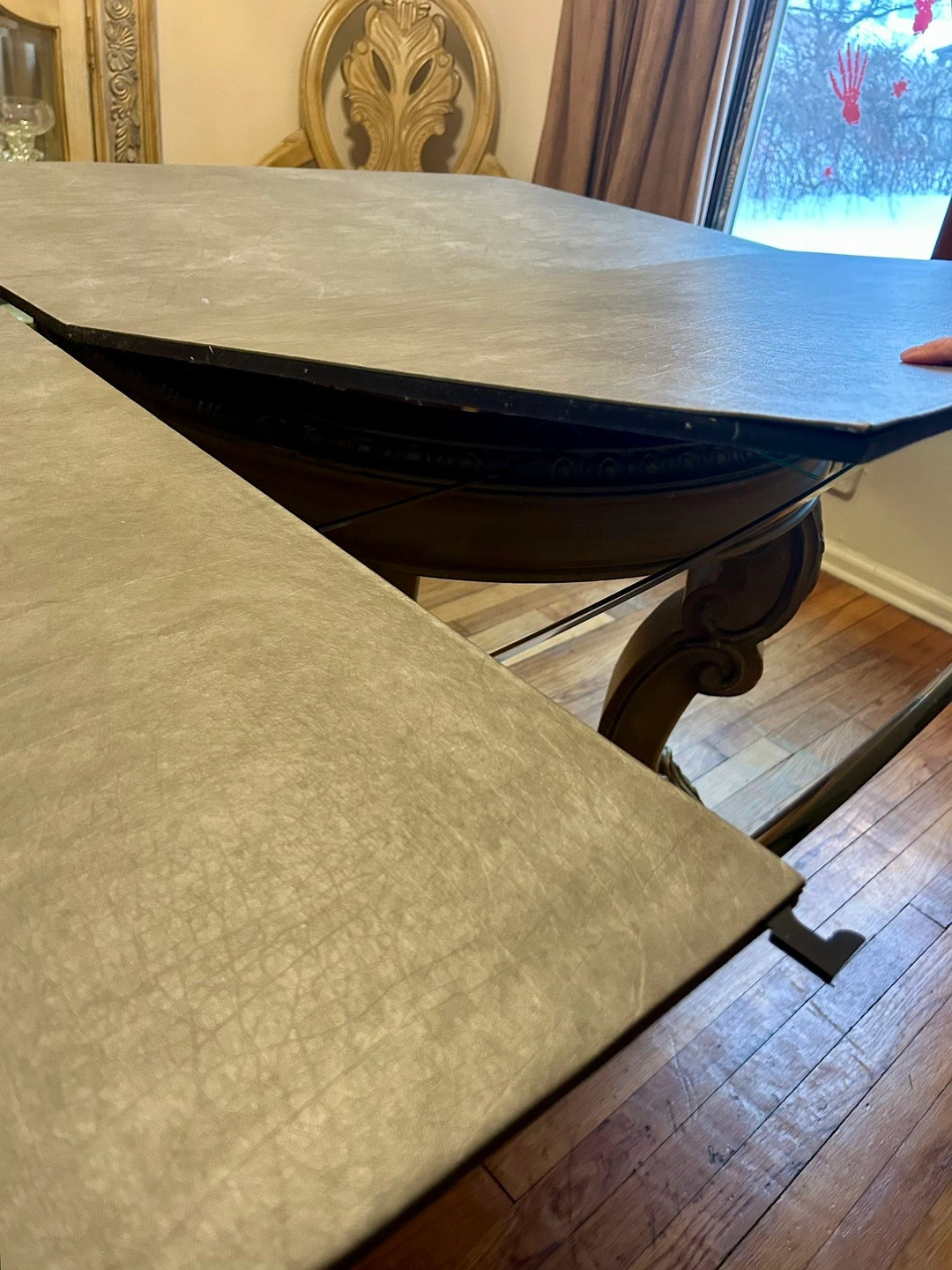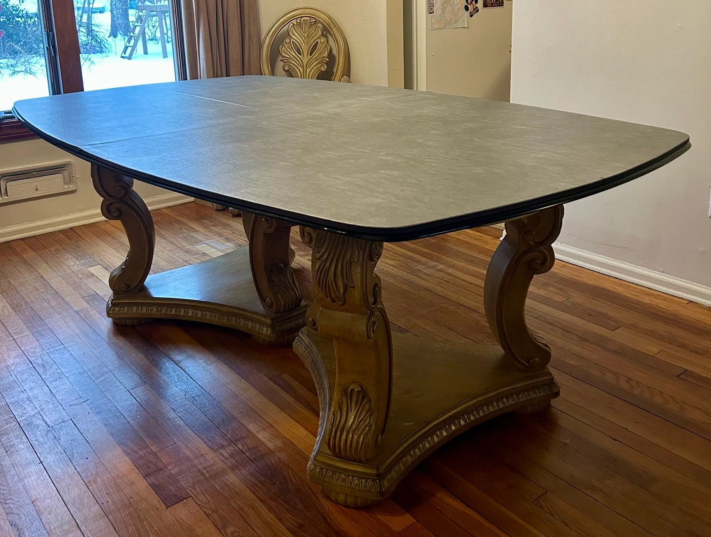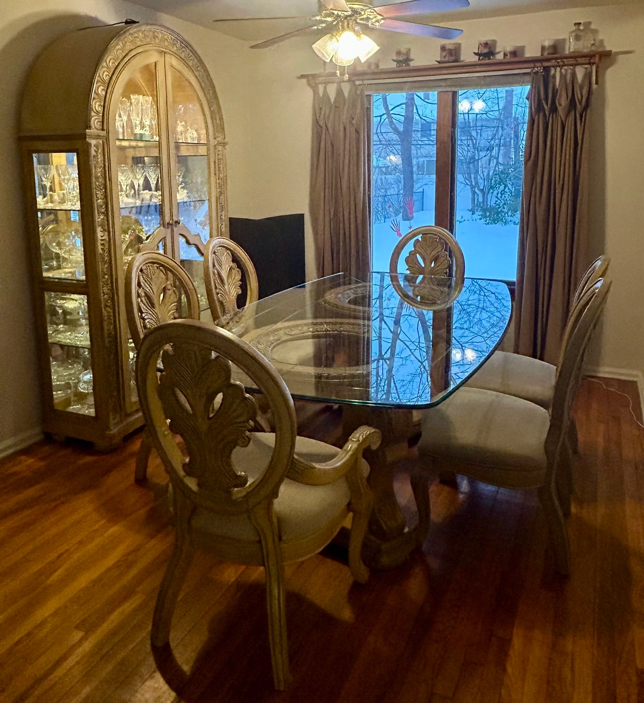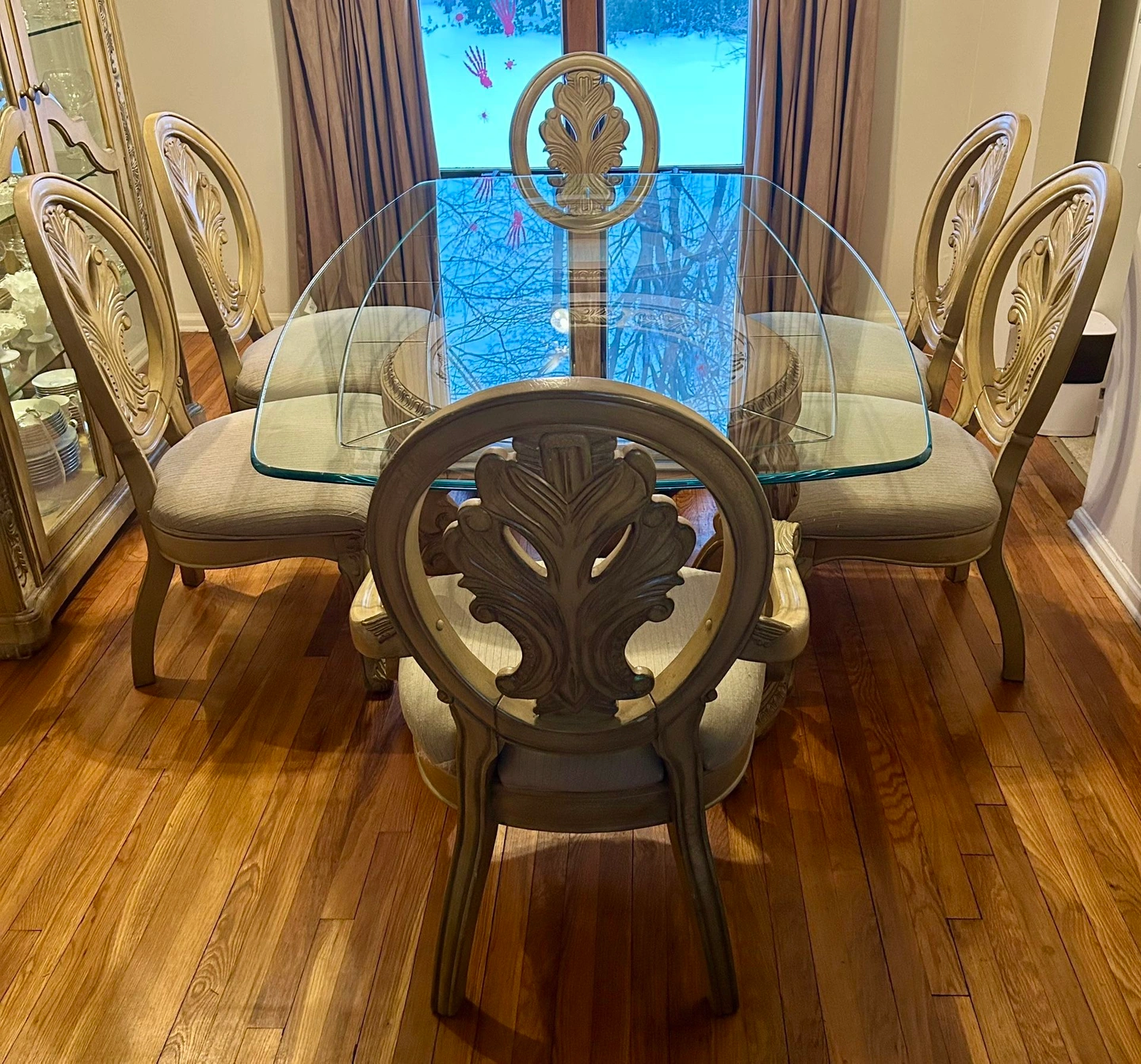 Gorgeous beveled glass top dining set with 2 ornate carved wood