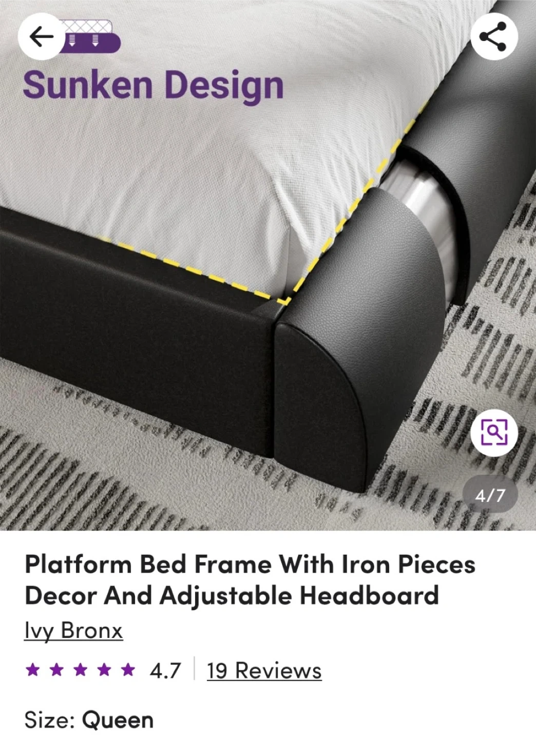 Selling an Ivy Bronx platform bed frame in Queen size. It features iron pieces decor and an adjustable headboard. The dimensions are approximately 94.09" x 64" x 33.27-34.45". Only Bed Frame No Mattress. Ready to go