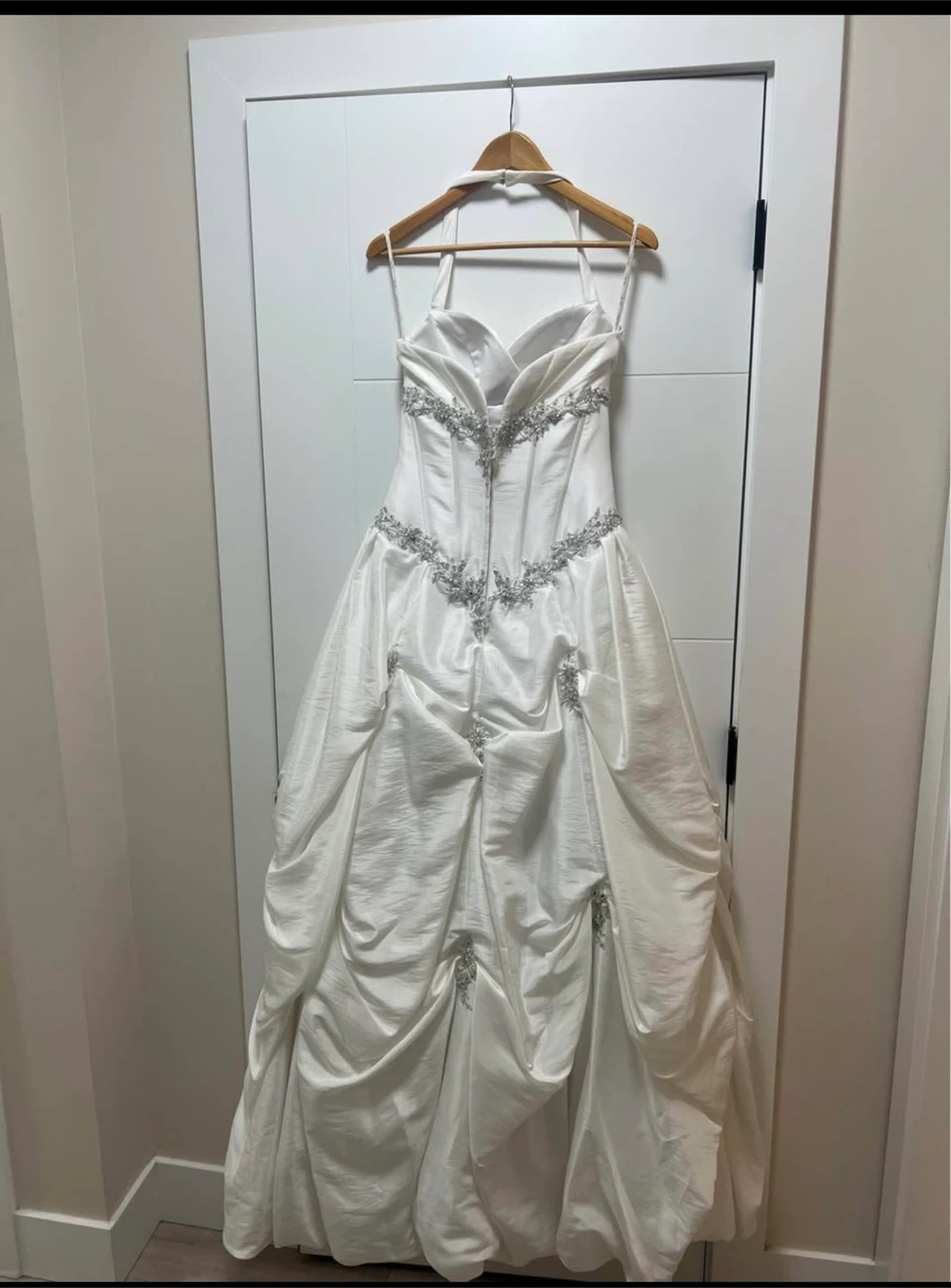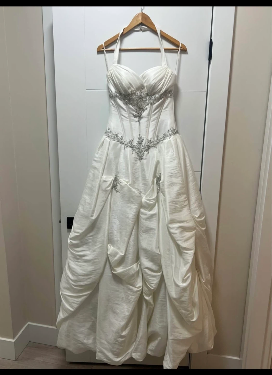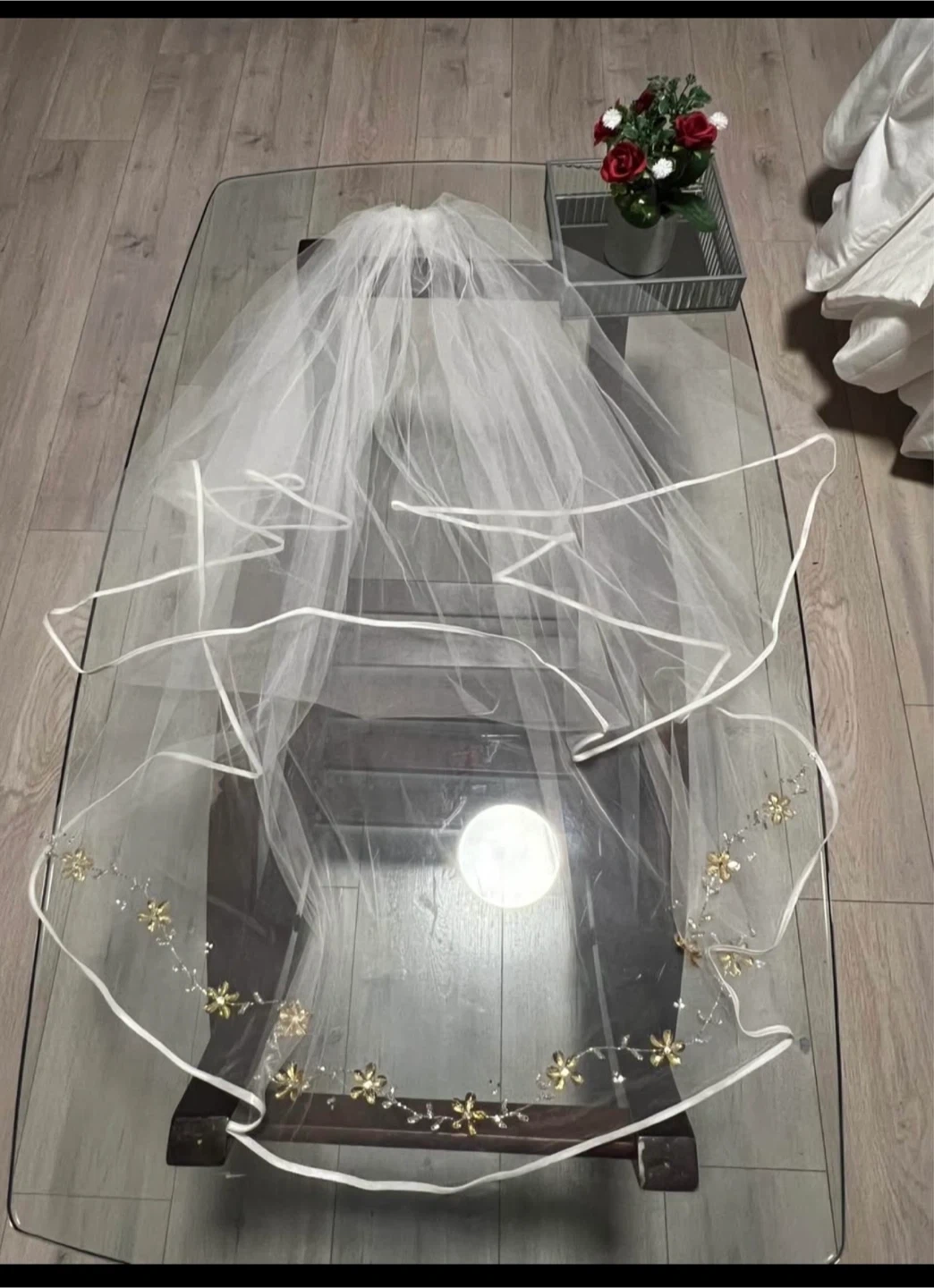 Beautiful ivory wedding dress with beaded embellishments. Includes a matching veil with gold floral accents. Dress size is 6.