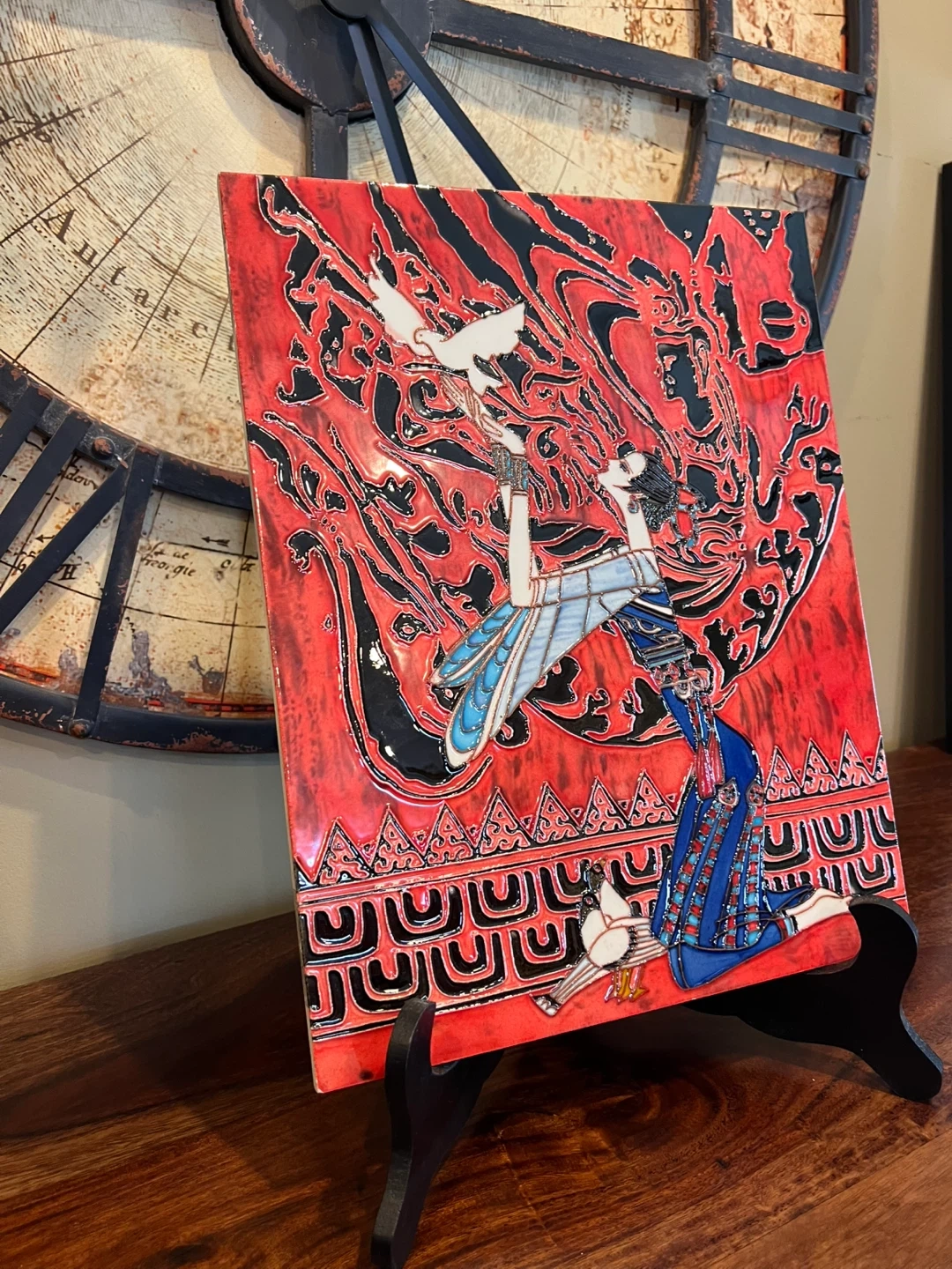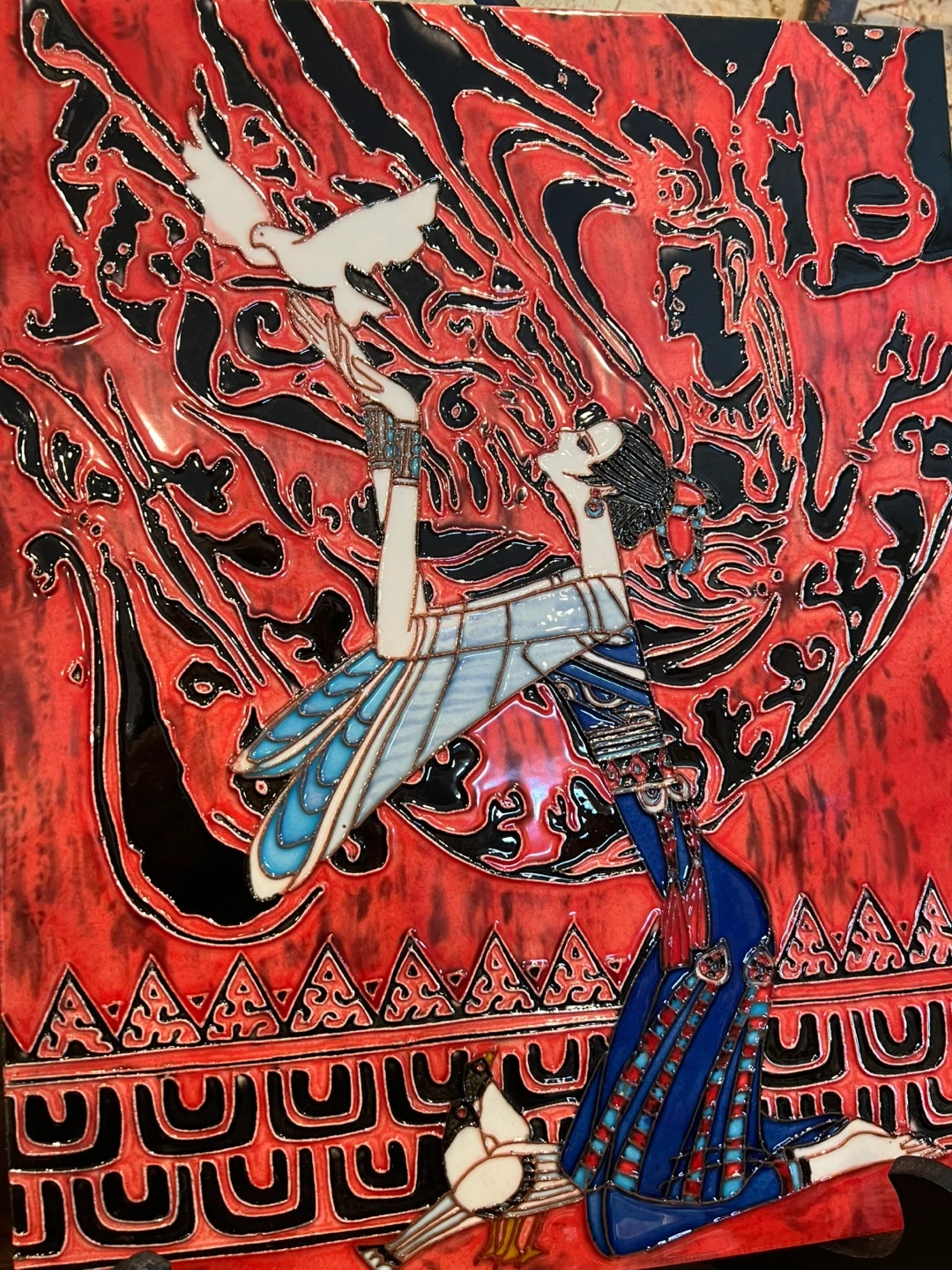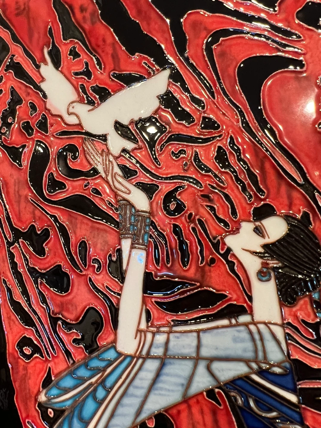 The piece features a stylized figure reaching upward toward a white bird (a dove), symbolizing goals of equality, development, and peace