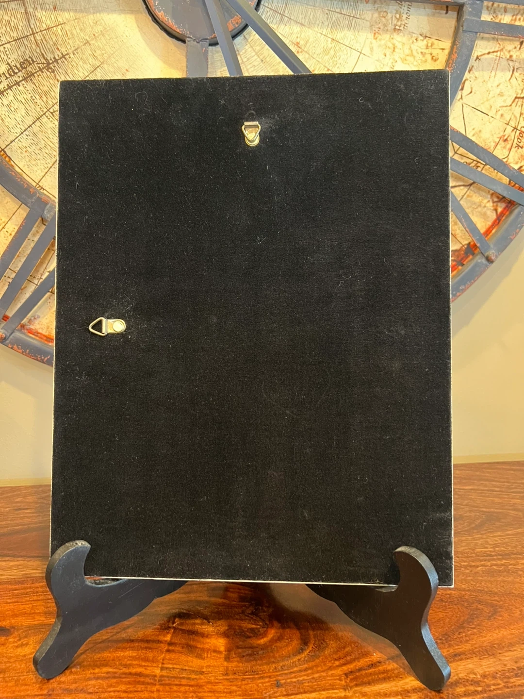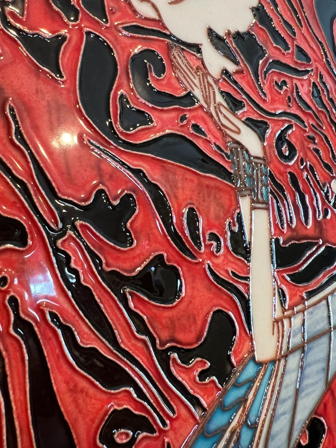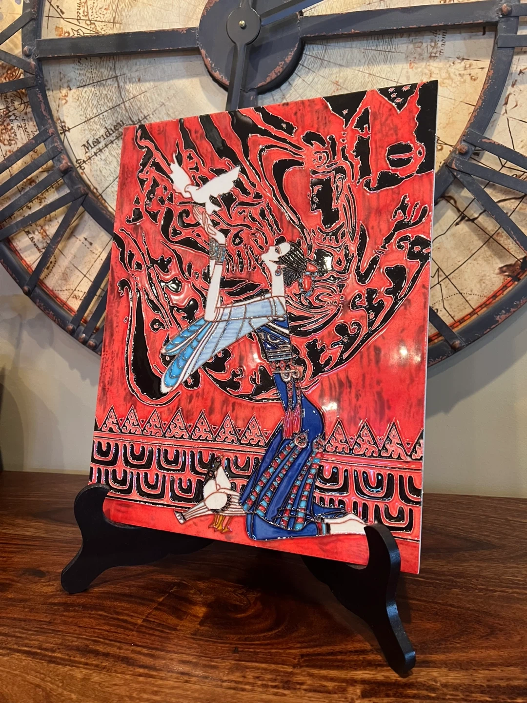 The piece features a stylized figure reaching upward toward a white bird (a dove), symbolizing goals of equality, development, and peace