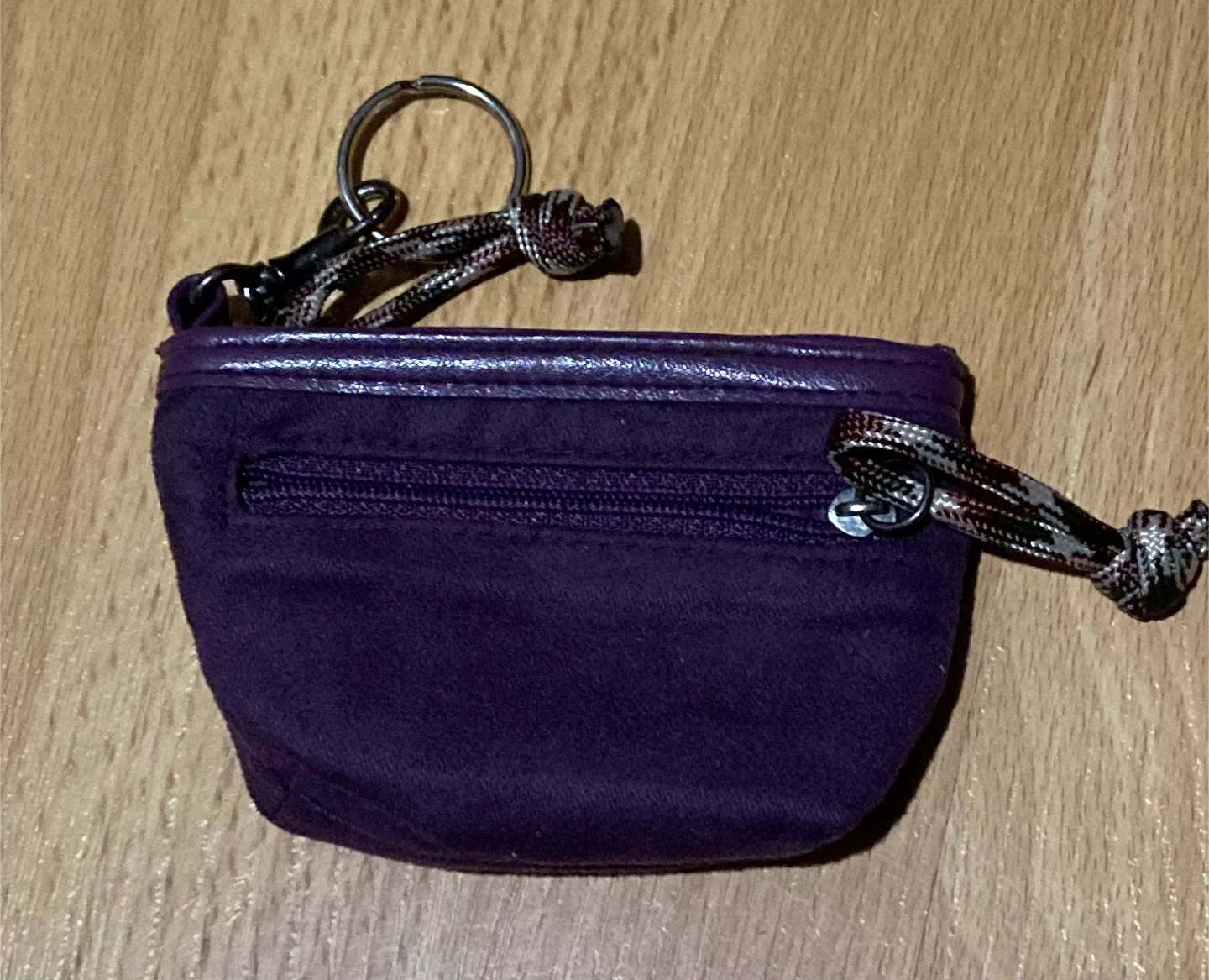 A small purple pouch with a zippered compartment. It's made of a soft material and has a decorative tassel and keychain attachment. Perfect for holding small essentials!