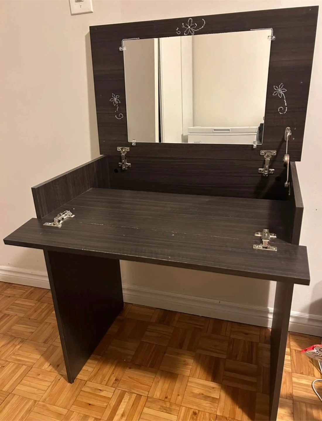 Dark wood vanity desk featuring a flip-top mirror and ample storage space inside. It's made of wood composite material. This desk is great for a bedroom or dressing area.