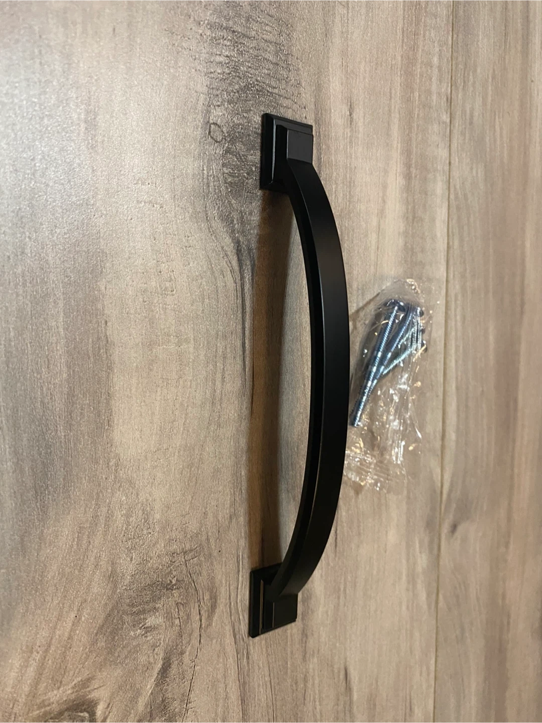 These black cabinet door handles come in a set of 10. They're made of metal with a matte black finish. Each handle includes mounting screws.