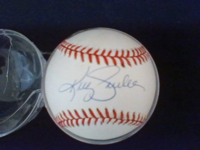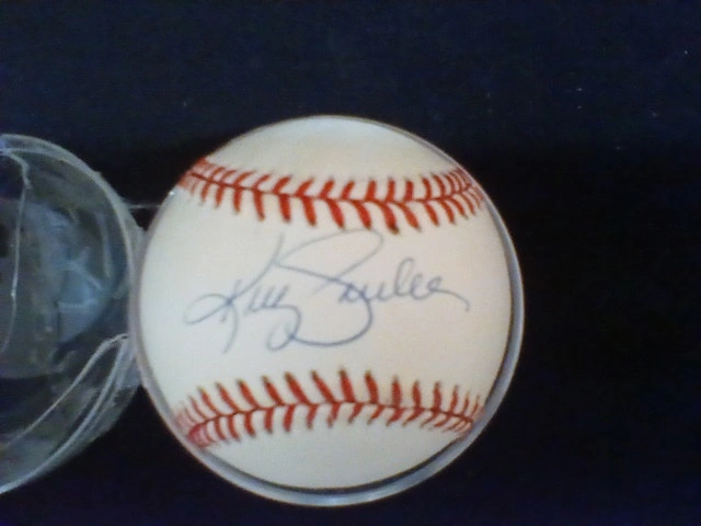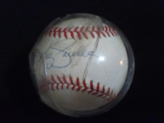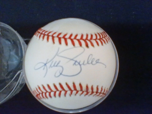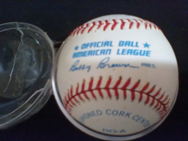Kelly Gruber autographed vintage baseball. Features Rowlings Official American League (Barry Brown President) Cushioned Center RO-A. In excellent condition, though the case is cracked. Please see pictures for details.