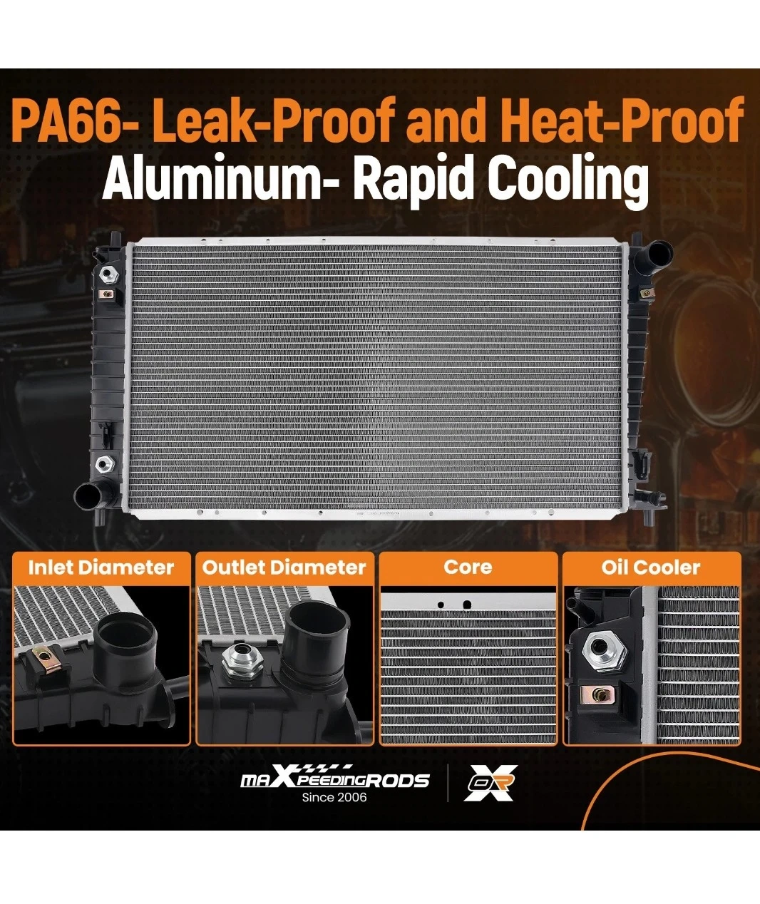 This aluminum radiator is designed for leak-proof and heat-proof performance. It features rapid cooling capabilities to keep your engine running smoothly. Inlet and outlet diameters are standard for easy installation. This radiator includes an oil cooler for enhanced efficiency.