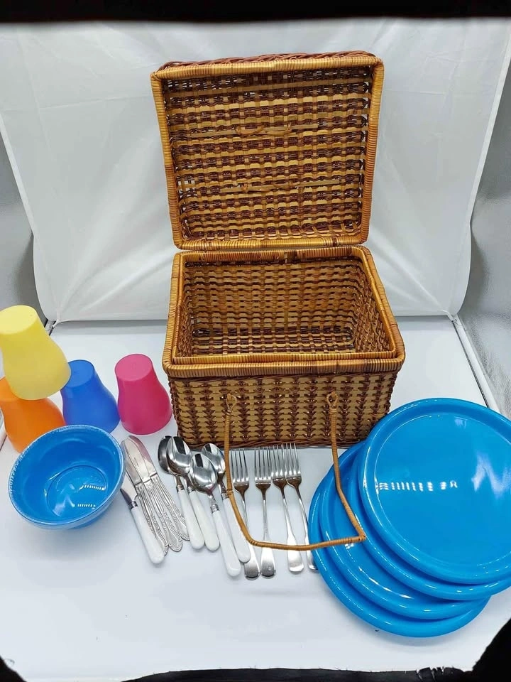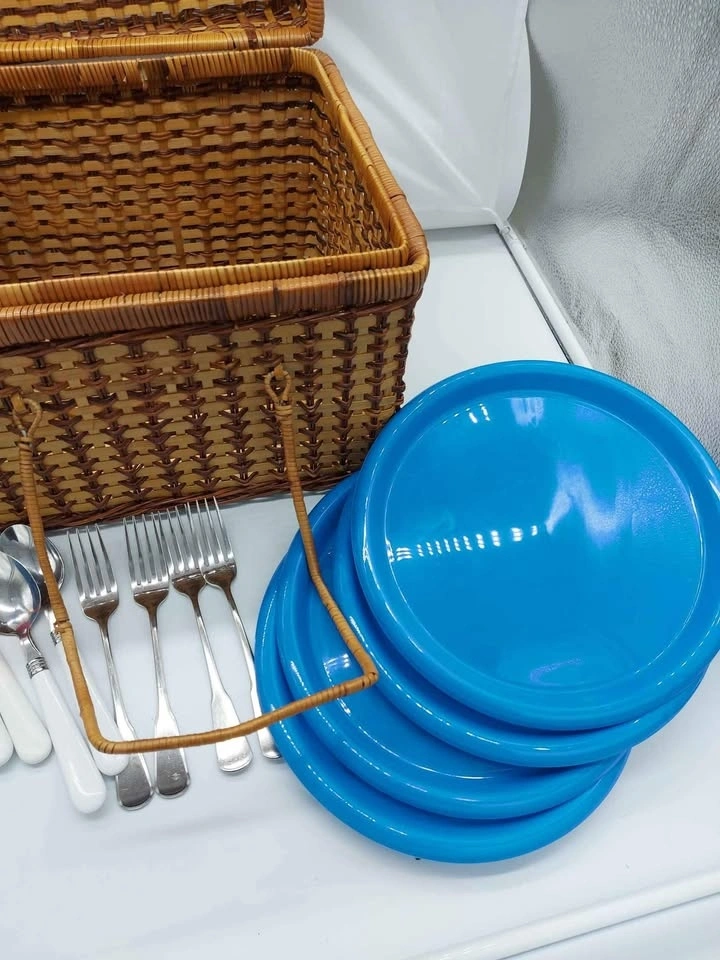 Vintage Wicker Basket with Set Of 4 Dinnerware