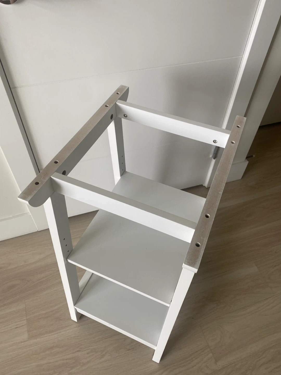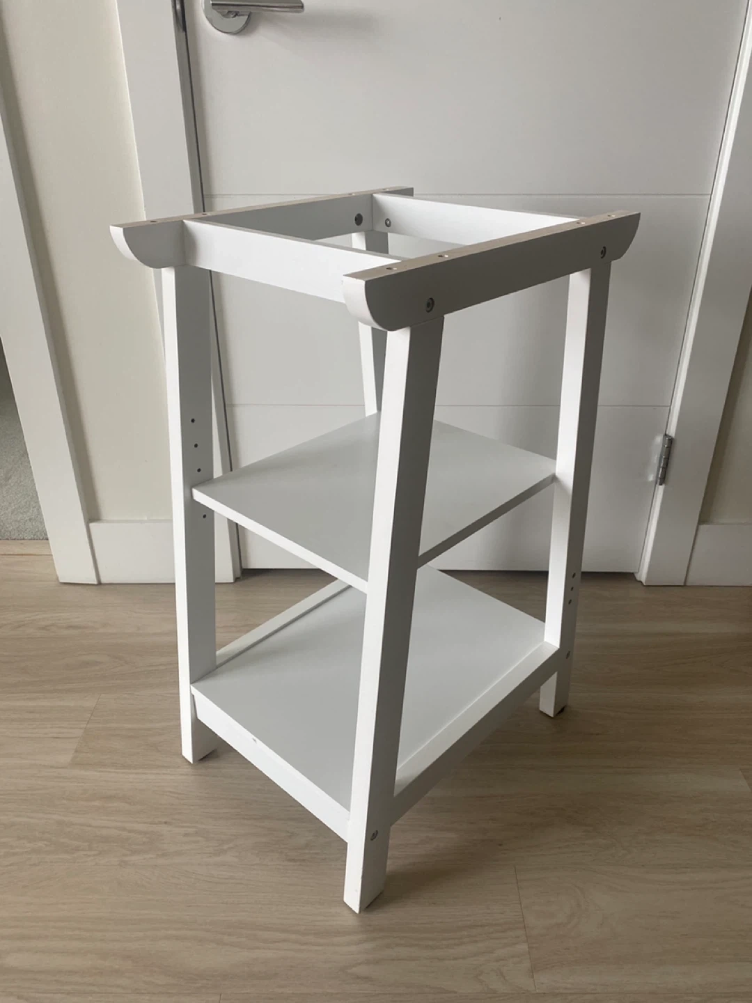 A simple white three-tier shelf unit is available. Its frame is white wood and it has three shelves. This unit could be useful for organizing items in a smaller space.