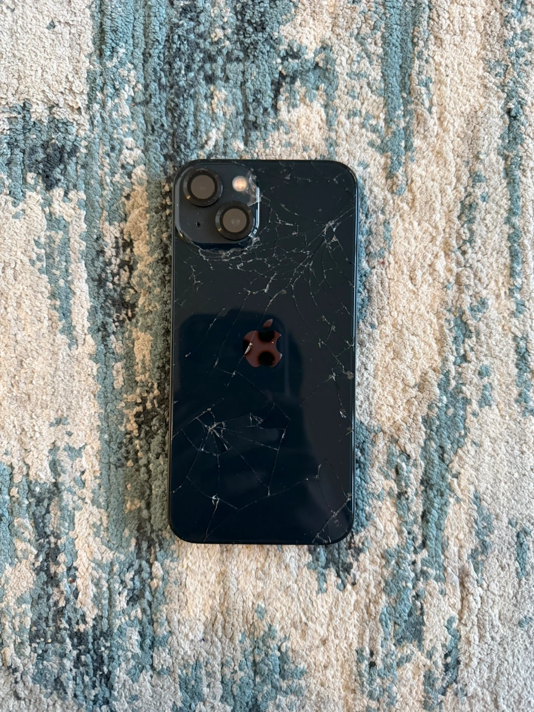 Black Apple iPhone 13 with a cracked back. This phone is in a dark blue colour. It's suitable for someone looking for parts or repair. Lagy