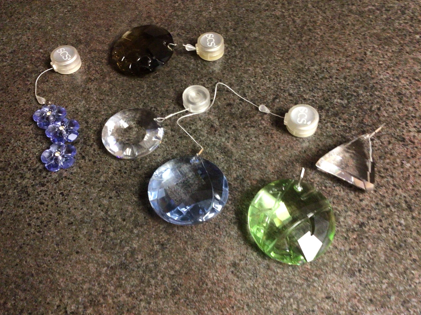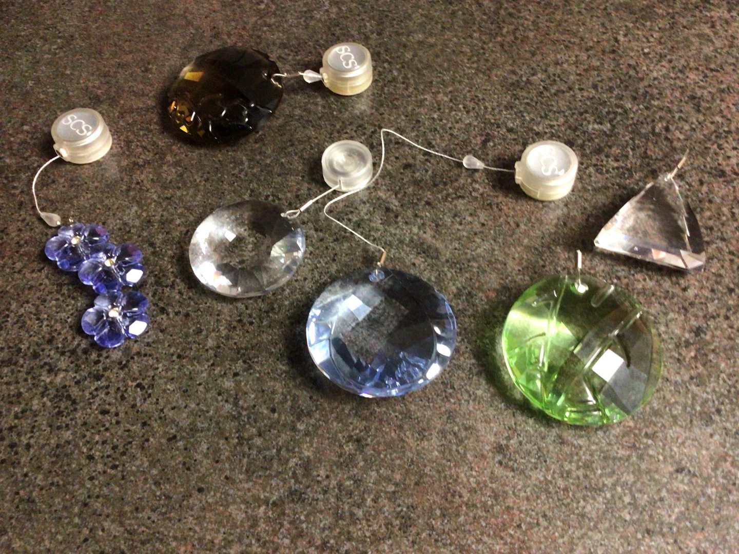 They come in various shapes and colours, including blue, green, clear, and brown. Each pendant has a small SCS connector. Perfect for adding a touch of sparkle to your home!